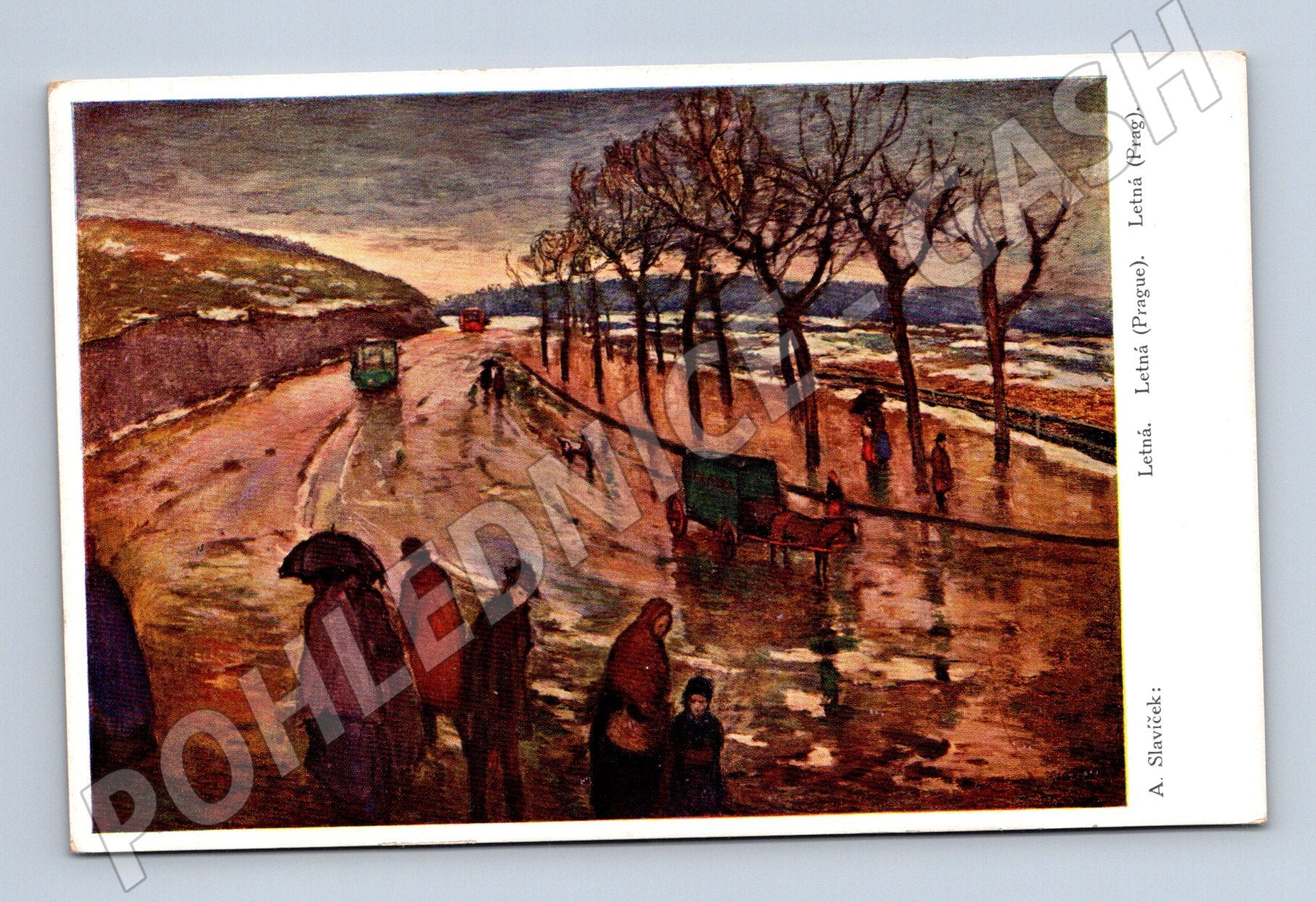 Umělecká pohlednice zobrazující Letnou v Praze, dílo známého českého malíře Antonína Slavíčka. Scéna zachycuje pražskou Letnou v melancholickém zimním či podzimním období, s rušnou silnicí, povozy a chodci, lemovanou stromy. Typické impresionistické pojetí s důrazem na atmosféru a barevnost. Na zadní straně pohlednice je logo vydavatele D. & J. Prague a místo pro adresu. Pohlednice je nevypísaná a dobře zachovalá.
