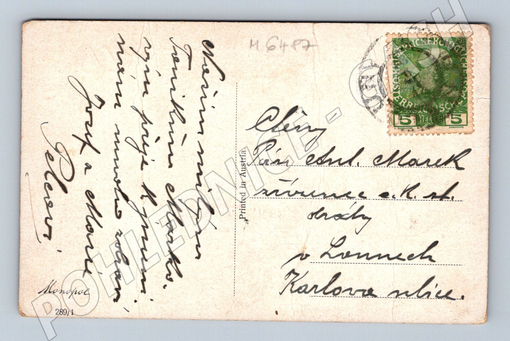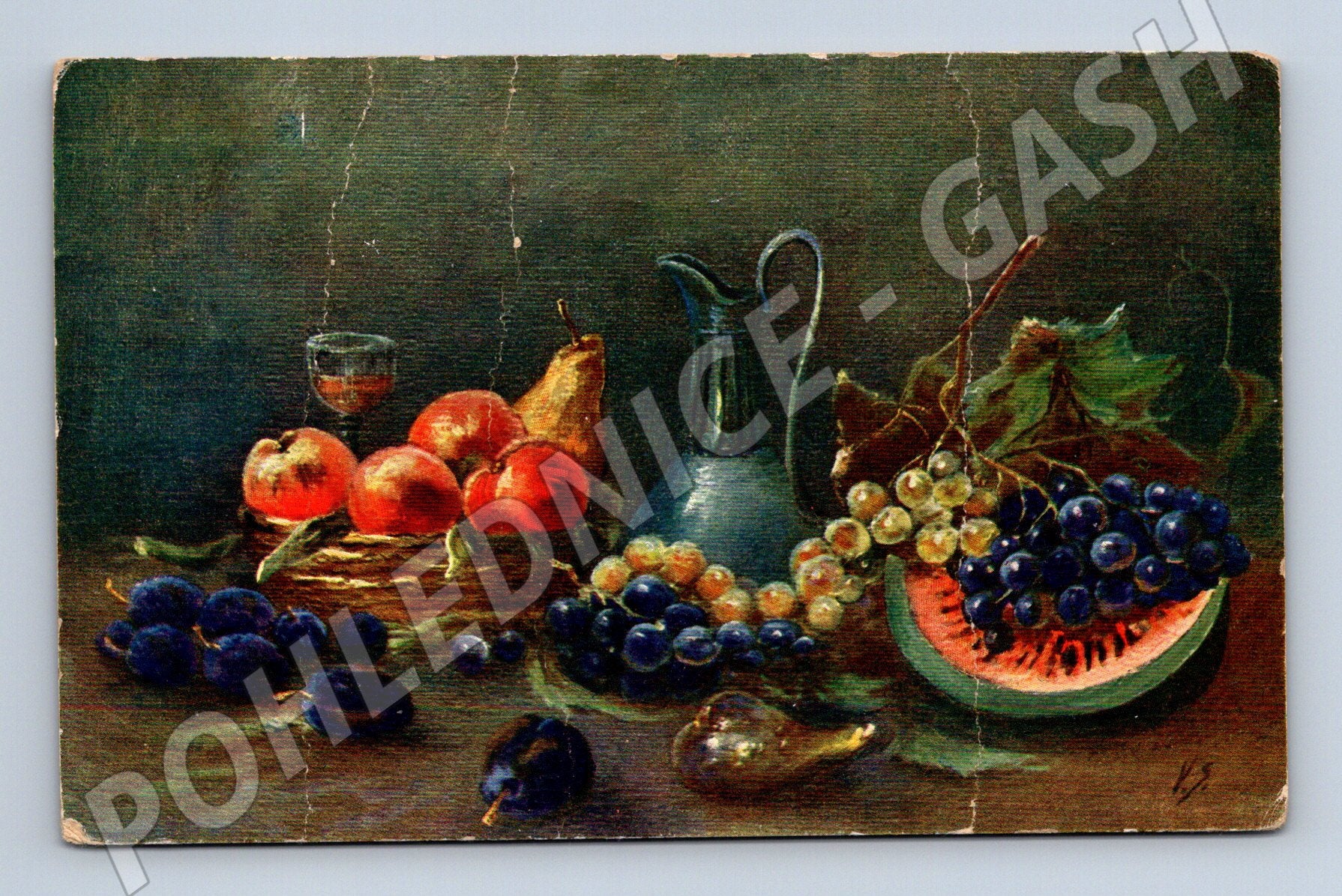 Starší pohlednice s motivem zátiší s ovocem a džbánkem. Na kresbě jsou zobrazeny ovoce (jablka, hrozny, meloun, švestky, hruška), sklenka a džbánek na tmavém pozadí. Zadní strana je popsána, opatřena původní rakouskou známkou s portrétem Františka Josefa I. a razítkem. Vytištěno v Rakousku, pohled je mírně opotřebovaný a nese stopy stáří včetně ohybů a drobných škrábanců. Atraktivní sběratelský kus z období Rakousko-Uherska, vhodný do sbírky historických pohlednic nebo malířství.