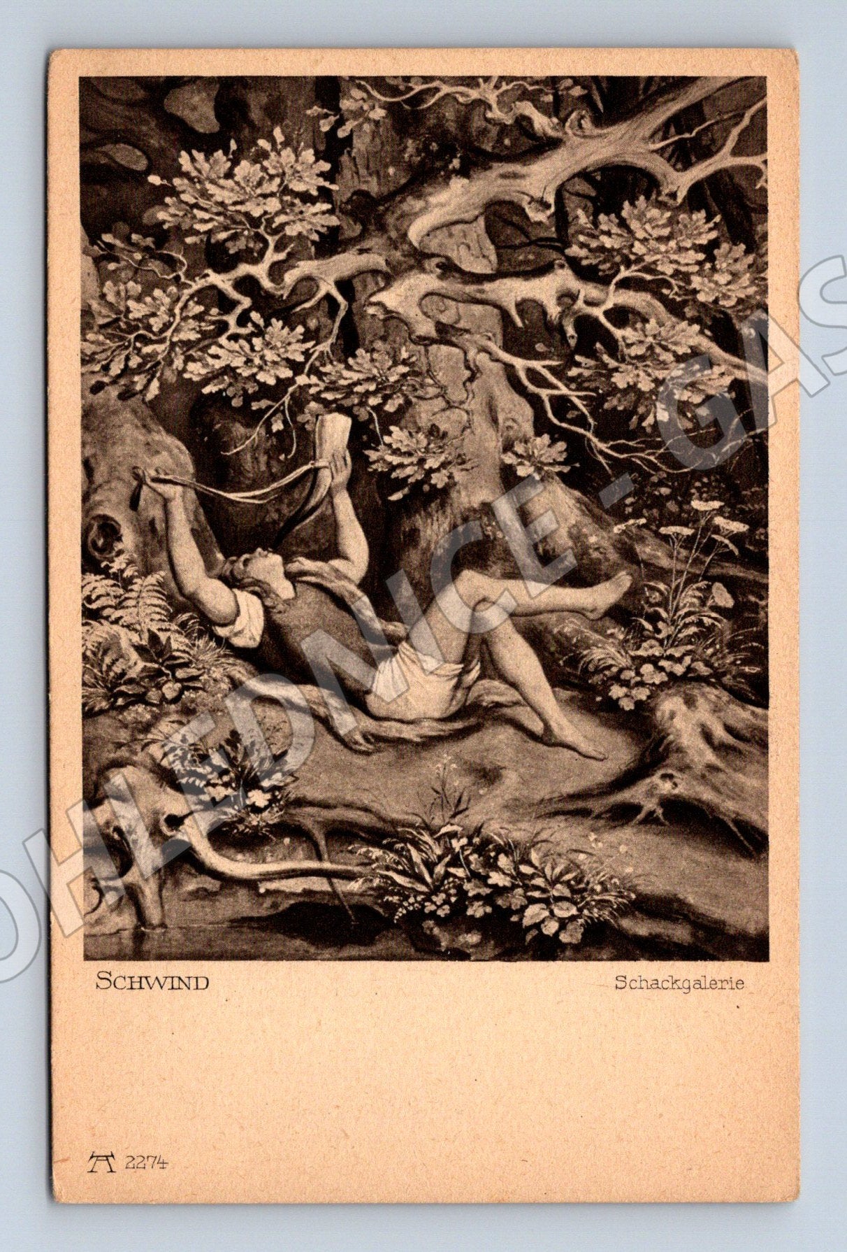 Starší umělecká pohlednice s reprodukcí obrazu od Moritze von Schwinda pojmenovaného Horn blower (Trubač). Pohlednice ukazuje postavu muže s trubkou ležícího na větvích stromu v lese. Pohlednice pochází ze série Schack Galerie, Mnichov (Schackgalerie München), vydavatel Universitäts Galerie. Číslo série: 2274. Zadní strana je nepopsaná, vhodné pro sběratele a milovníky historické korespondence nebo uměleckých pohlednic. Velmi dobrý stav, bez známek použití. Ideální do sbírky.