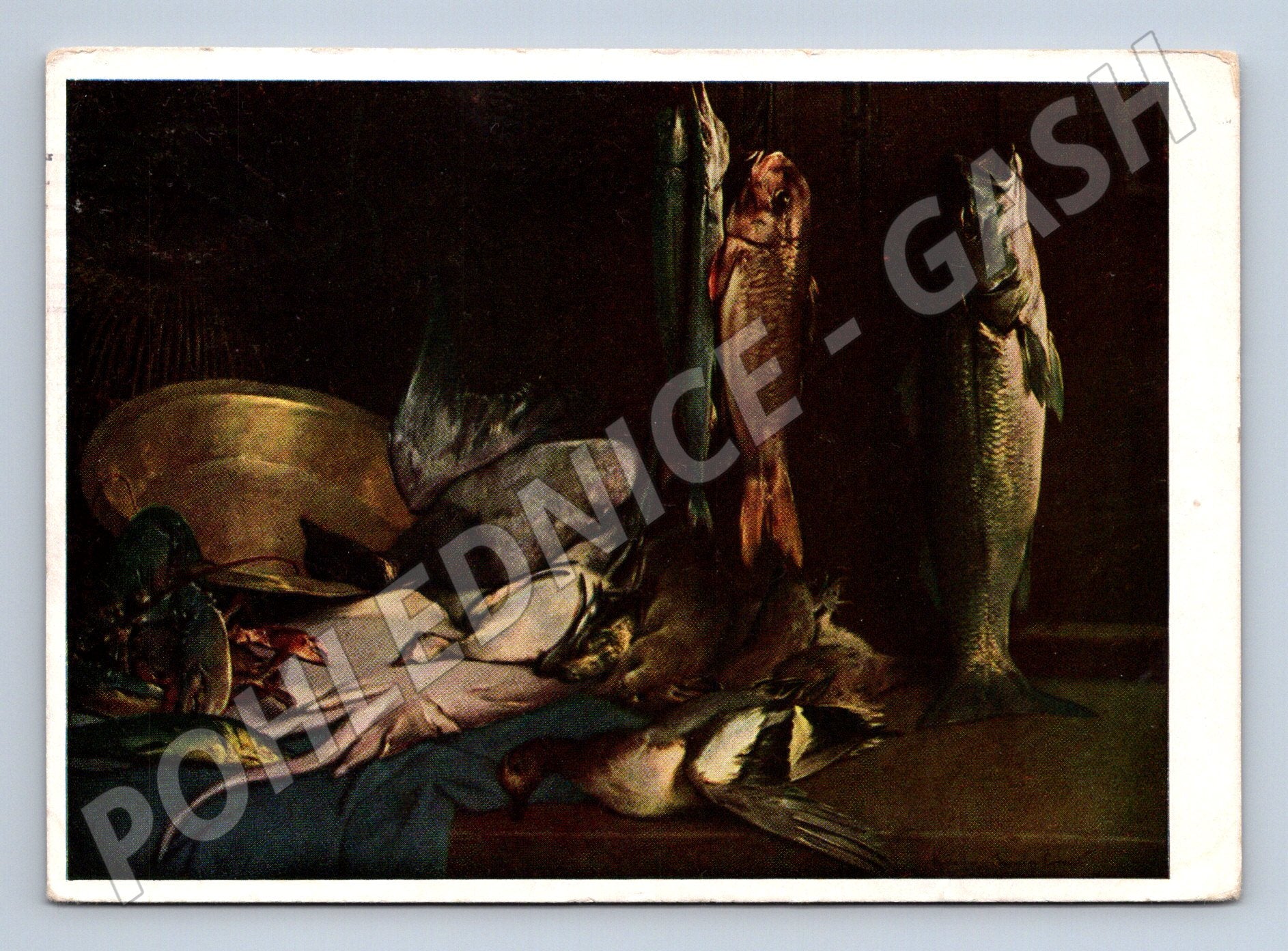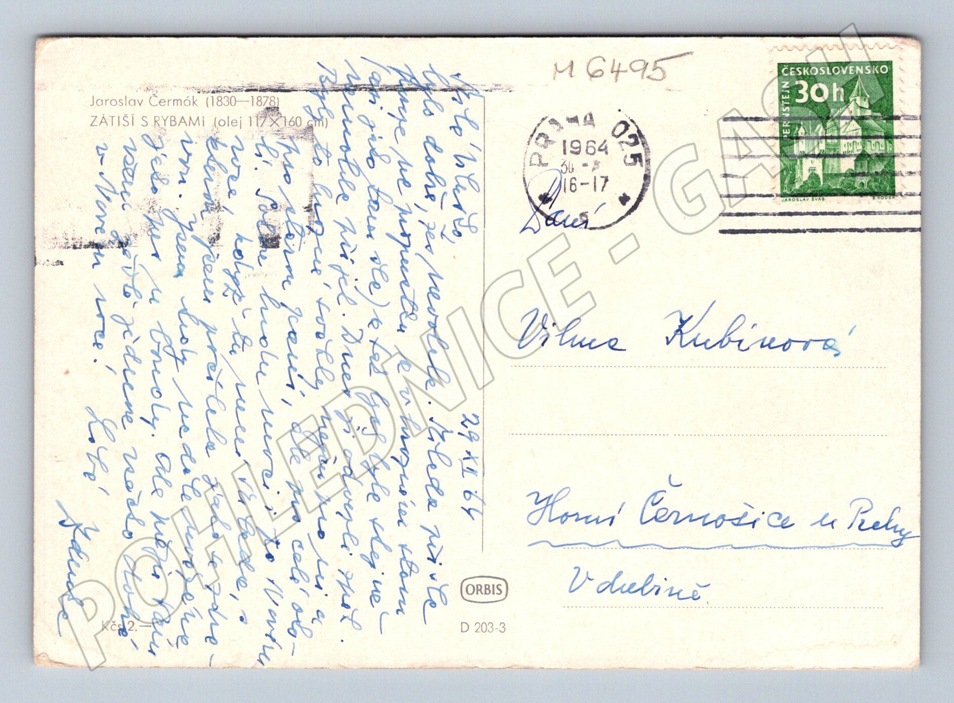 Pohlednice z roku 1964, nesoucí reprodukci slavného obrazu Zátiší s rybami od Jaroslava Čermáka (1830–1878). Olejomalba zachycuje aranžmá několika druhů ryb a mořských živočichů na tmavém pozadí, typické pro klasickou zátiší. Na zadní straně pohlednice je ručně psaný text, původní známka (30 h Československo - Křivoklát), a poštovní razítko z Prahy. Pohlednice je vhodná pro sběratele umění a starých poštovních karet.