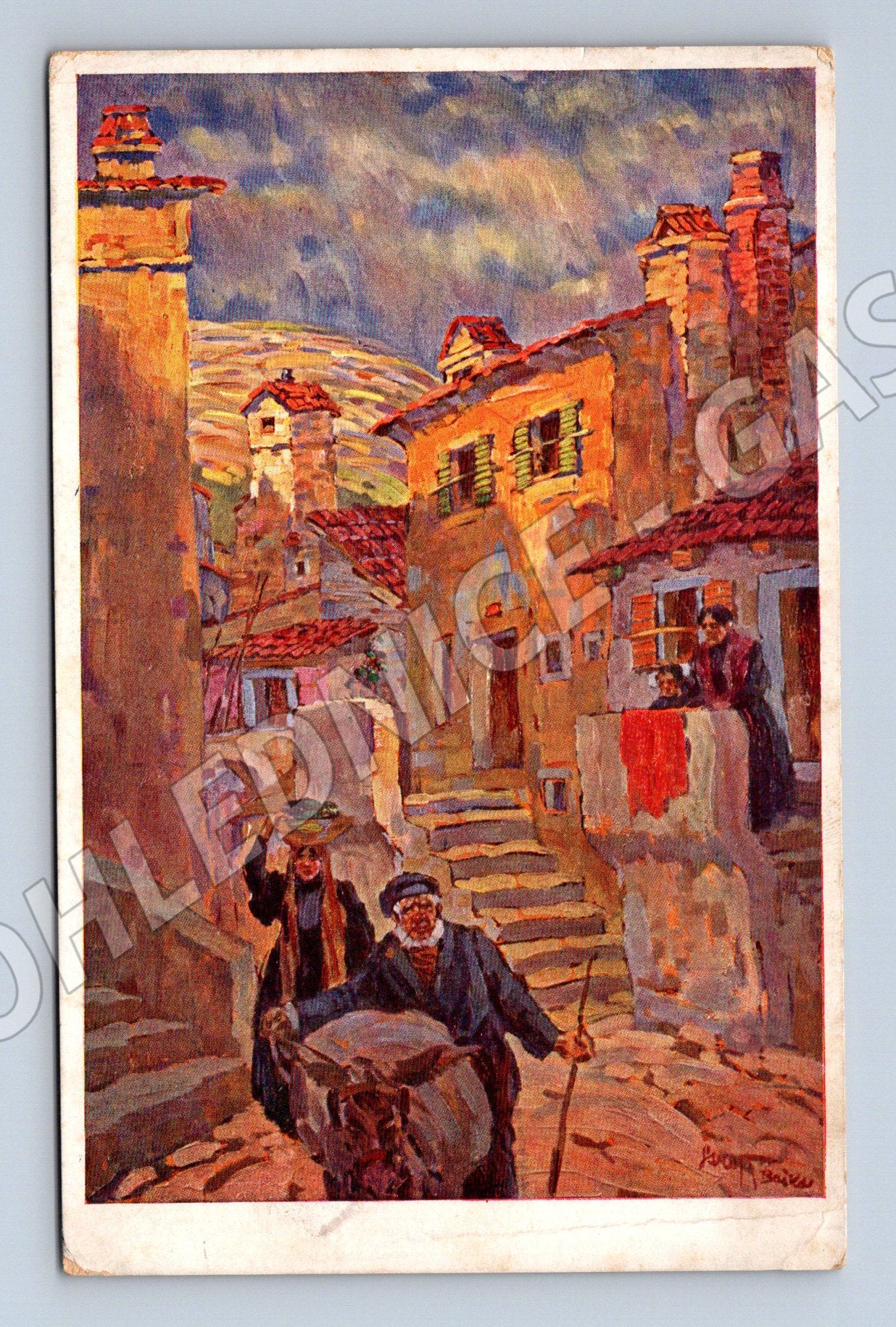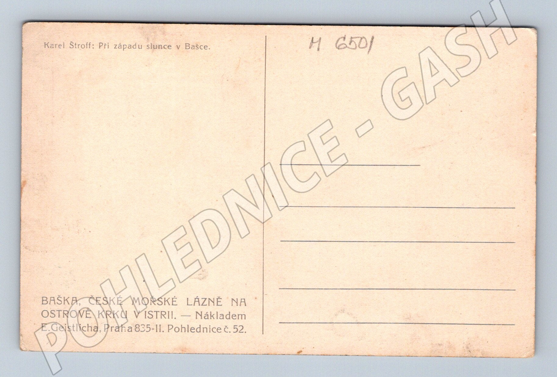 Originální stará pohlednice s názvem Při západu slunce v Bašce od malíře Karla Štroffa. Pohlednice zachycuje malebnou scénu z města Baška na ostrově Krk v Istrii, Československé mořské lázně. Přední strana je tištěna v barvě, zadní strana obsahuje informace o vydavateli (E. Geistlich, Praha) a číslo pohlednice 52. Krásné syté barvy a výrazný malířský styl znázorňují atmosféru večera u moře. Jedná se o sběratelsky zajímavý kus vhodný pro milovníky malířských pohlednic i motivů z Jadranu. Stav viz foto, neprošlá poštou.
