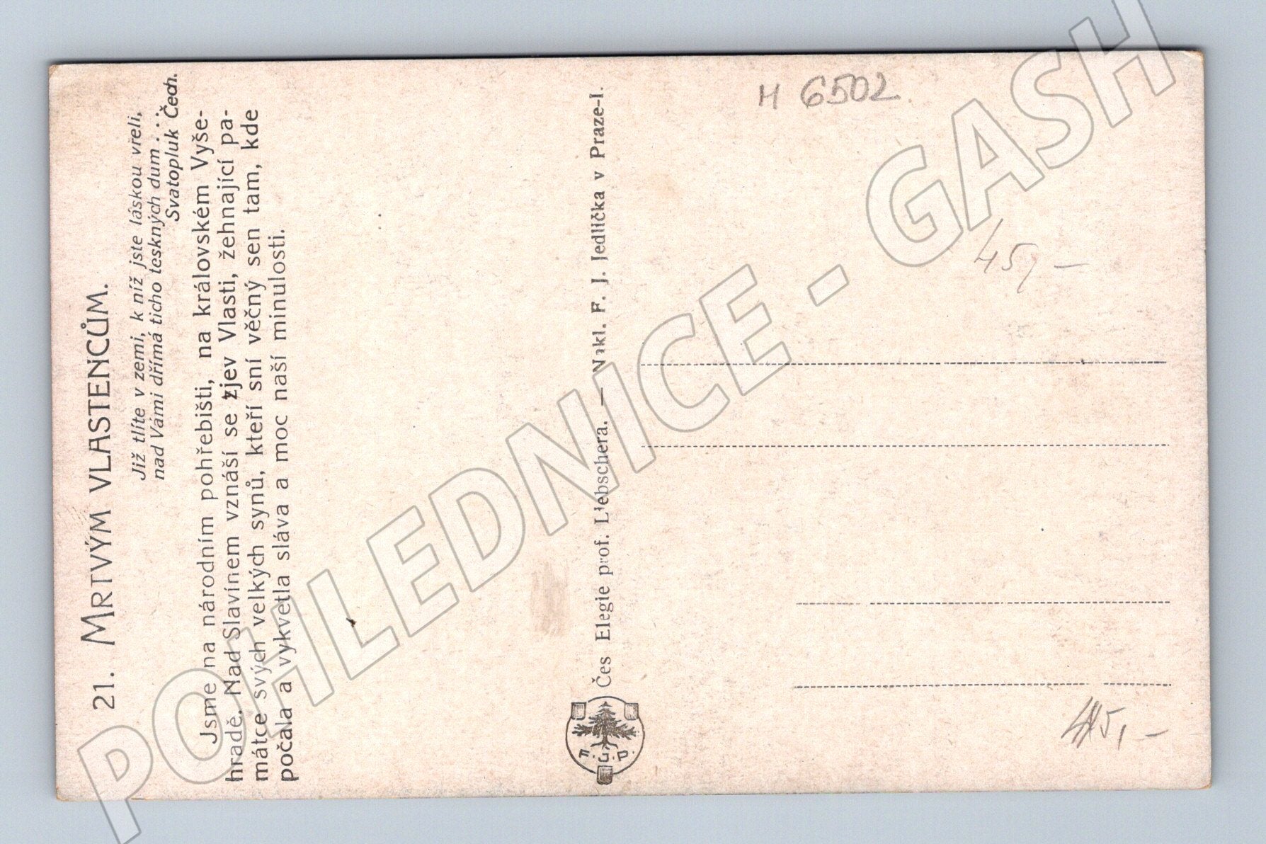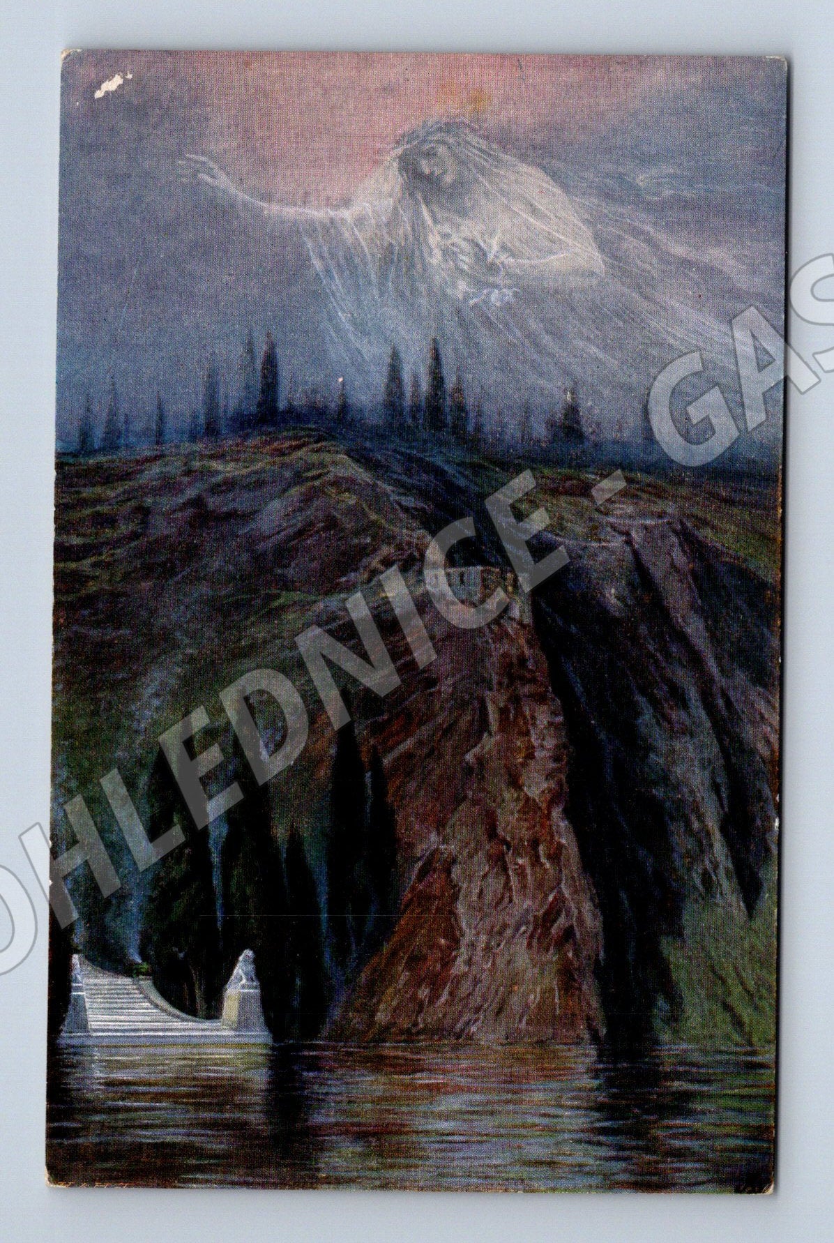 Originální stará pohlednice s názvem Mrtvým vlastencům z cyklu Českých elegií. Pohlednice zobrazuje uměleckou malbu s pietní a národní tematikou – motiv krajiny s hradem na kopci a jemně ilustrovanou postavou ve snu či duchovní světlosti. Na zadní straně je uveden český text vztahující se k památce národních velikánů, kteří sní věčný sen v naší vlasti. Vydal prof. J. Lebscheter v Praze. Stav viz foto, drobné opotřebení a stopy času. Skvělý sběratelský kousek pro milovníky české historie a umění.