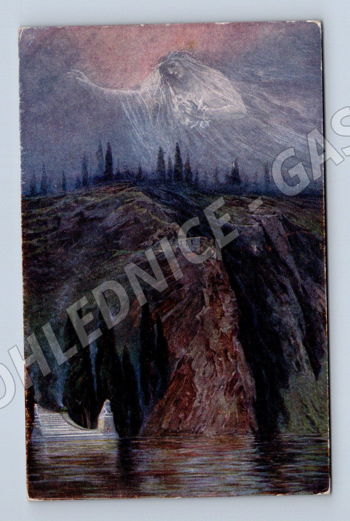 Starší pohlednice s uměleckým ztvárněním s názvem Mrtvým vlastencům (č. 21). Pohlednice zachycuje malovaný motiv s národní tematikou, připomínající českou historii a vlastenectví. Výjev vyjadřuje pietu k padlým vlastencům s poetickým textem vzpomínajícím národní tradice a význam Vyšehradu. Na zadní straně jsou informace o sérii a citace z české elegie. Pohlednice nenese žádné známky poštovního použití, v zachovalém stavu dle obrázku, vhodná pro sběratelské účely či milovníky českého malířství a historie. Rozměry klasického pohlednicového formátu.
