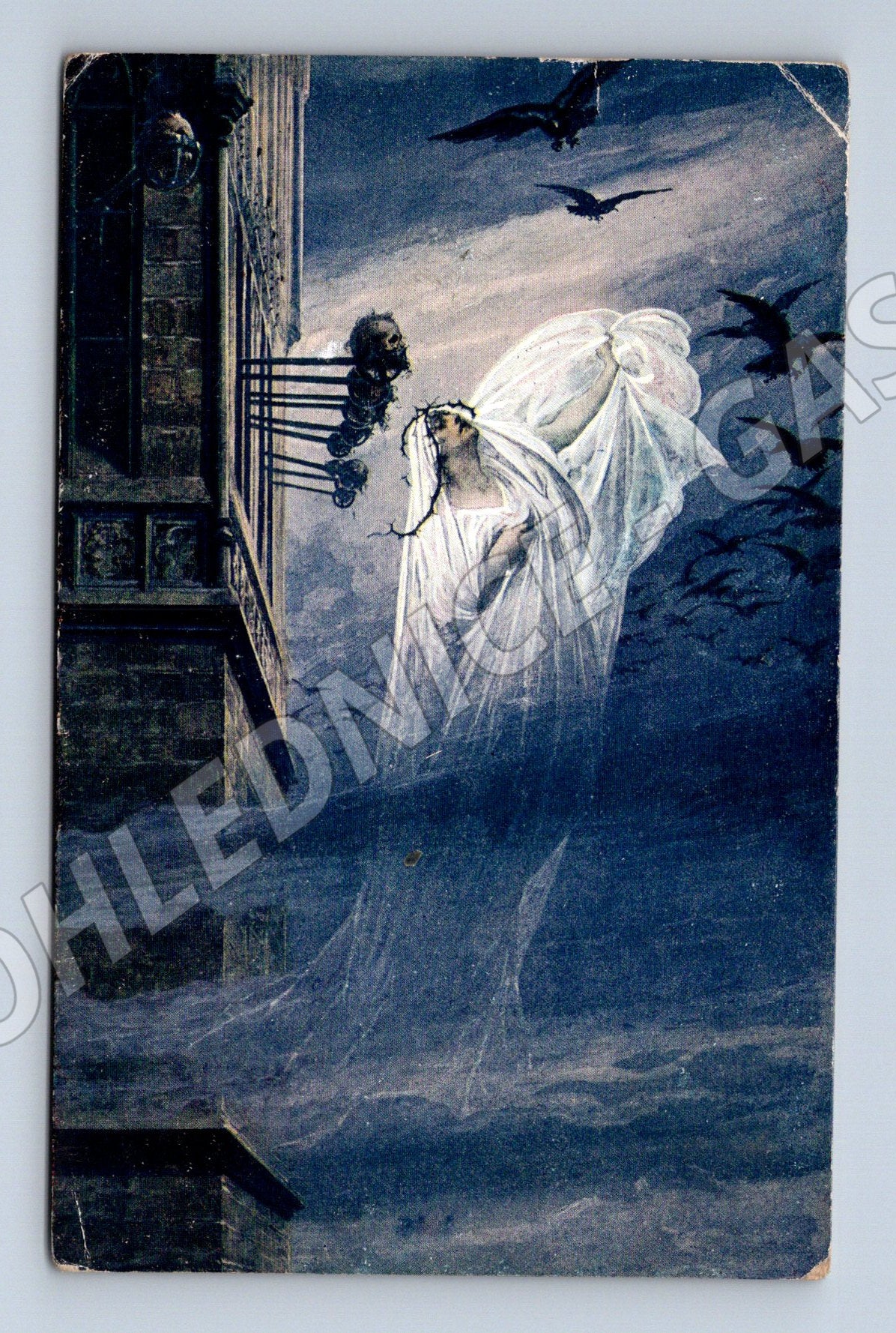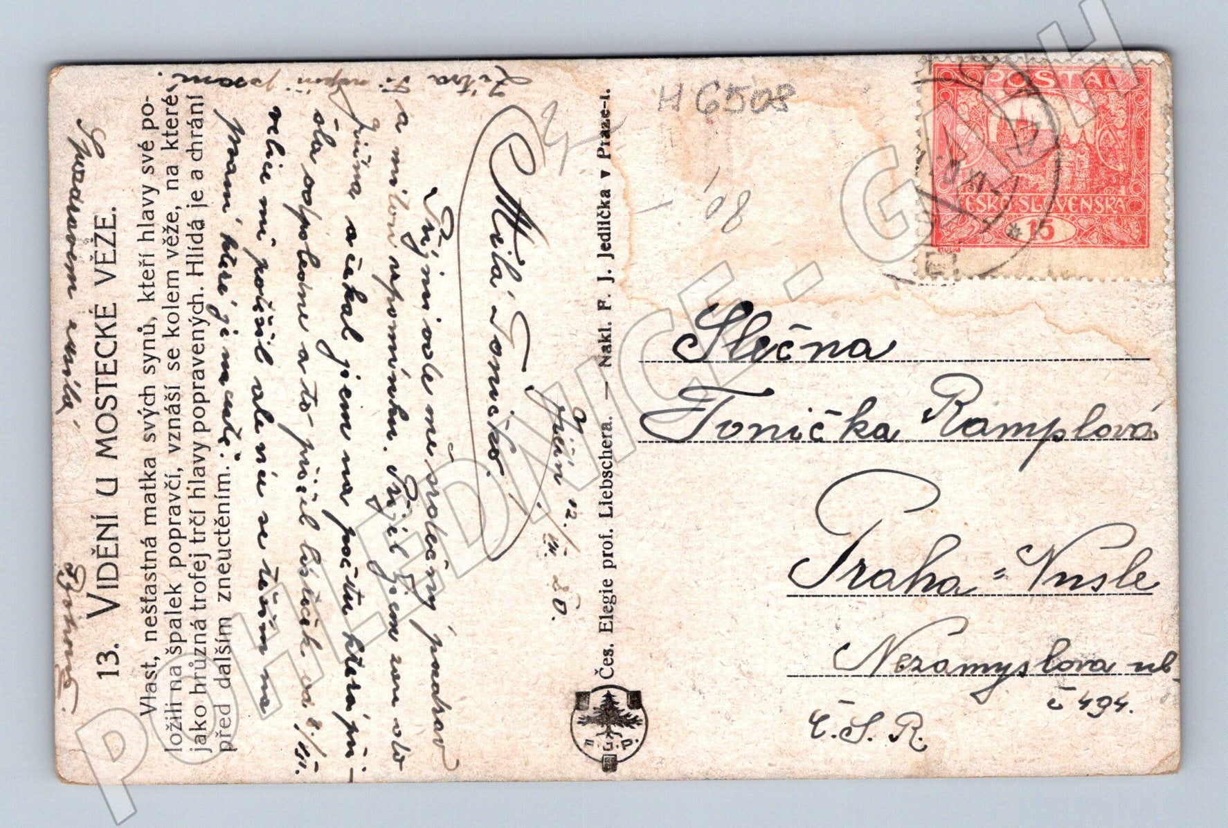 Originální stará pohlednice s názvem Vidění u mostecké věže . Pohlednice zobrazuje dramatickou a ponurou uměleckou scénu ducha nad pražskou krajinou, doprovázeného hejnem ptáků. Na rubu je ručně psaný text, adresa a známka z období Československa, datace dle razítka cca první polovina 20. století. Sbírkový kus vhodný pro milovníky starých pohlednic i zájemce o uměleckou či fantastickou tematiku. Pohlednice nese stopy běžného opotřebení odpovídající stáří - viz fotografie.