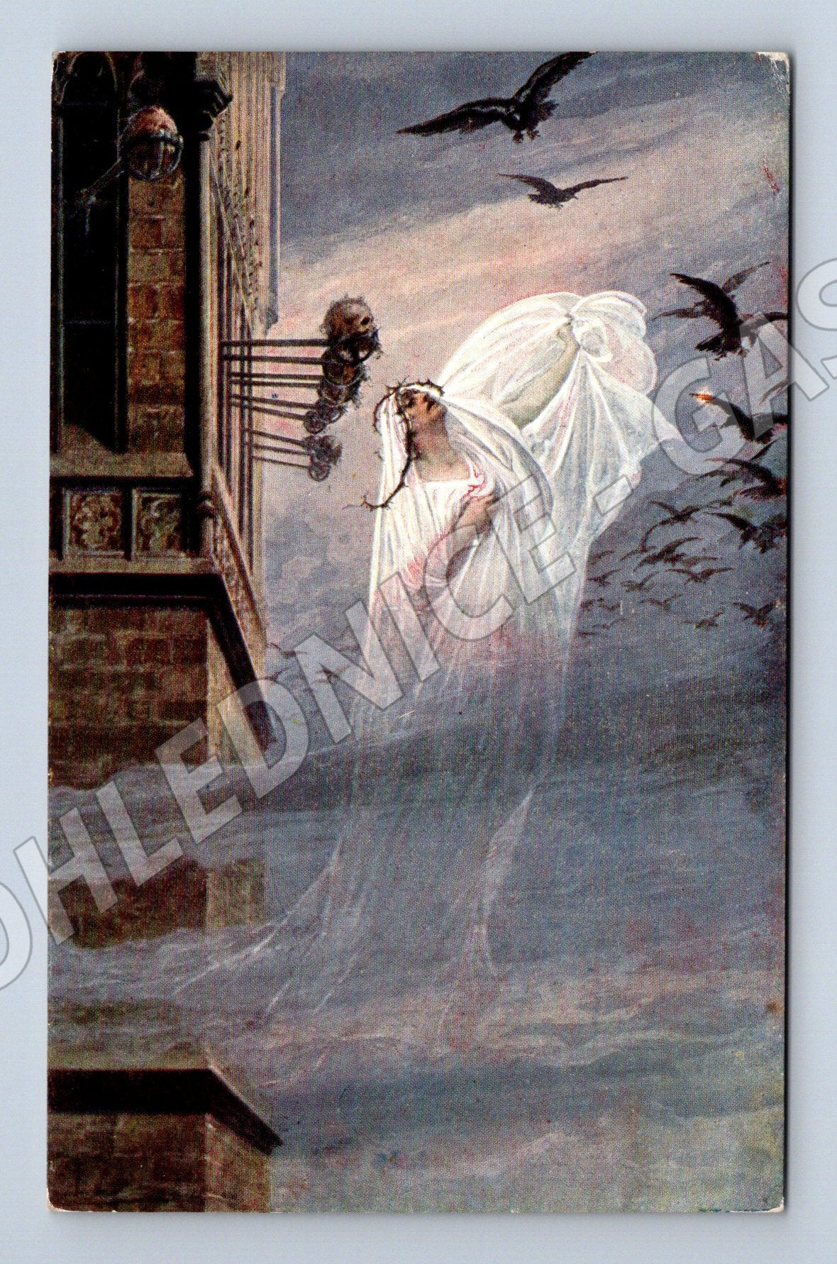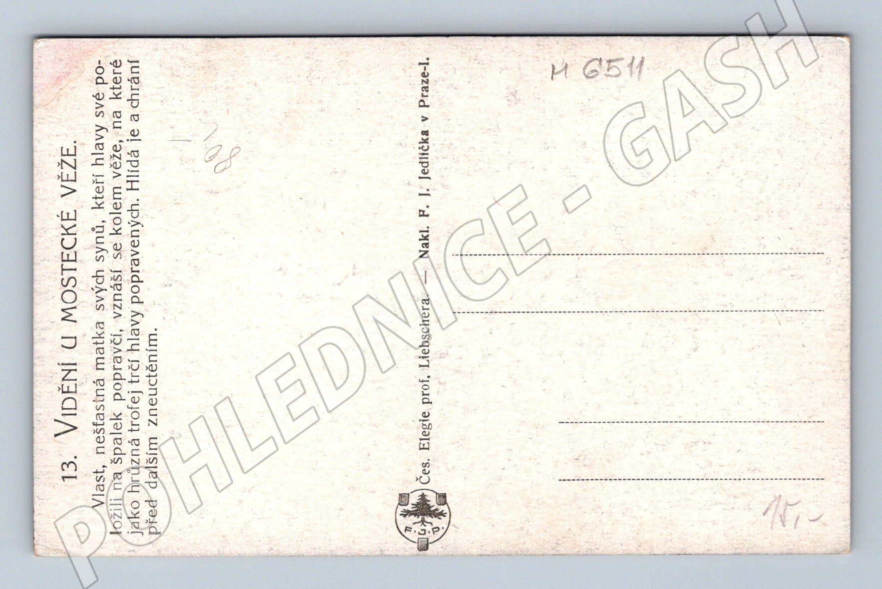 Originální stará pohlednice s názvem Vidění u mostecké věže . Pohlednice zobrazuje alegorickou scénu podle pověsti, kdy nešťastná matka v bílém šatu navštěvuje mosteckou věž, kde byly na špalek pokládány hlavy popravených, mezi nimiž byli i její synové. Umělecké zpracování evokuje melancholickou atmosféru, ilustrace je detailně propracovaná a náleží ke sběratelsky zajímavým kusům zobrazujícím pražskou historii a legendy. Na zadní straně vysvětlující text k motivu. Vydal prof. J. Lepschera, nakl. F. J. Jedlička v Praze. Pohlednice je v dobrém sběratelském stavu, neprošlá poštou, pouze drobné známky stáří.