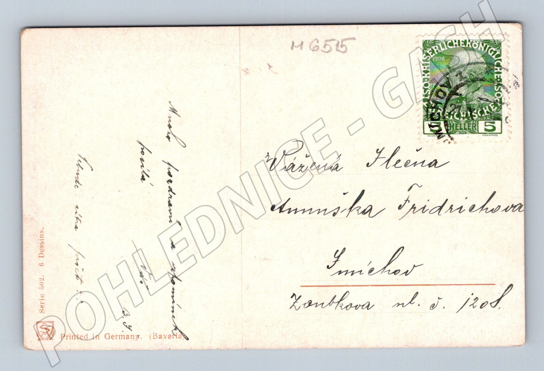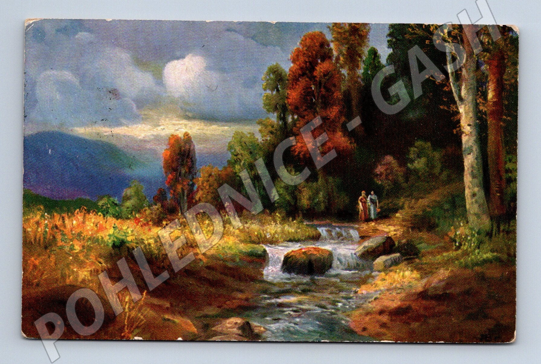 Starobylá pohlednice malého formátu, vydaná pravděpodobně před rokem 1950, s krásnou malovanou krajinou – les, potok, dva lidé na cestě. Tato pohlednice byla vytištěna v Německu (Bavorsko), je poštou prošlá, opatřena rakousko-uherskou známkou s vyobrazením Františka Josefa I. v hodnotě 5 hellerů. Na zadní straně je ručně psaný vzkaz a adresa do Smíchova. Výborný sběratelský kus – zajímavá ukázka dobové korespondence, krásně zachovalé barvy a originální atmosféra historického okresu.