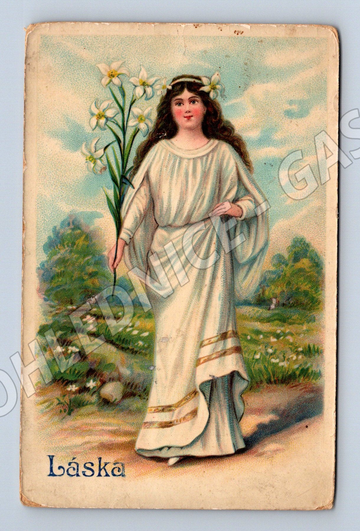 Starobylá pohlednice s názvem Láska z období před rokem 1950 s krásnou jemnou kresbou ženy v bílých šatech a květinovým motivem v ruce. Pohlednice má ručně psaný text a adresu na druhé straně, včetně historické známky a razítka. Mírně opotřebované okraje ukazují na její stáří, ale obrázek i text zůstávají dobře čitelné. Vhodná pro sběratele starých pohlednic nebo milovníky historické grafiky. Raritní kousek pocházející z České republiky (Made in Germany, používané pro český trh).