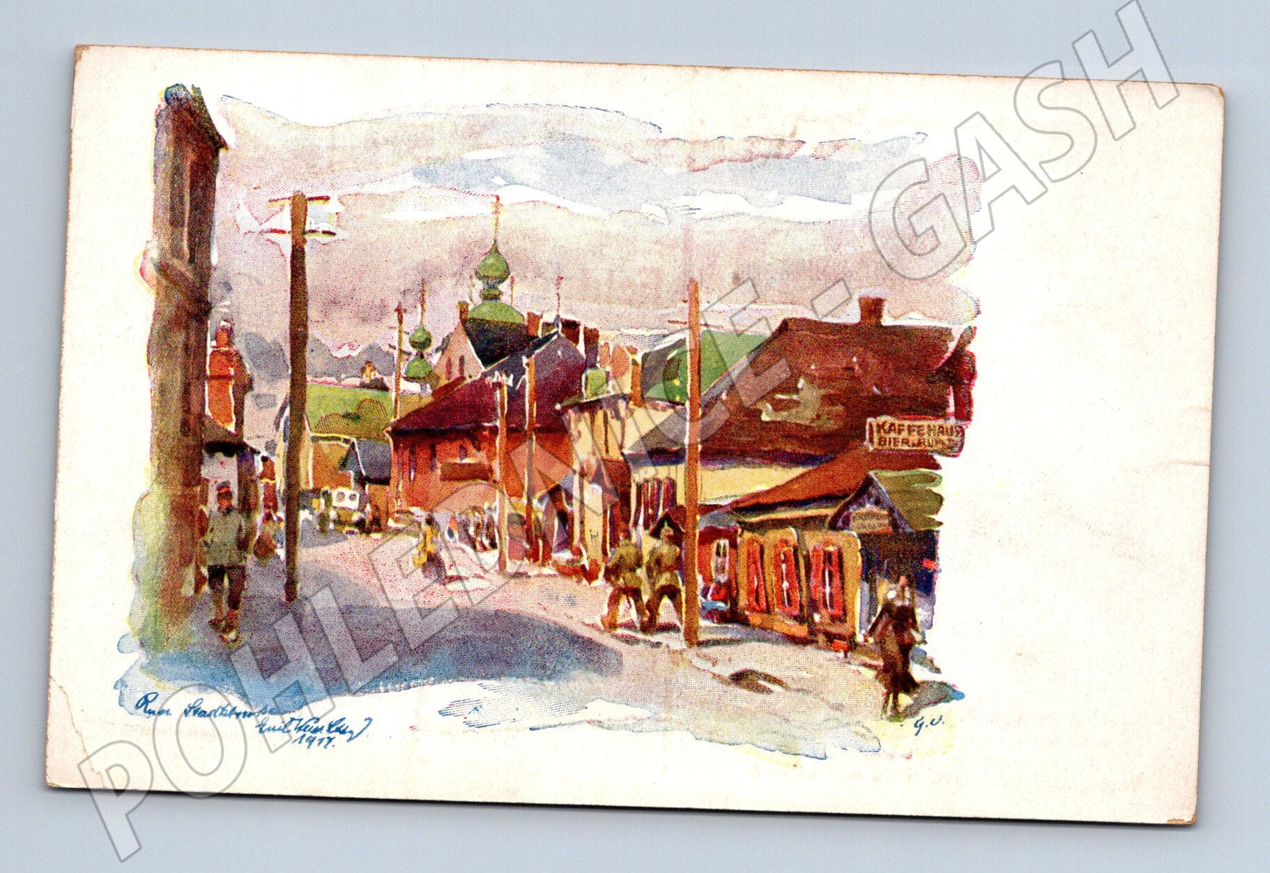 Originální historická pohlednice s názvem Wolhynische Städtebilder (Volyňská města), série 1, vydaná během první světové války pro polní poštu (Feldpostkarte). Akvarelová malba zachycuje typickou ulici a architekturu města s dominantními pravoslavnými chrámy a živou ulicí. Ve spodní části vlevo je podpis a letopočet 1917. Pohlednice nebyla použitá, rub je čistý s německým popisem a značkou vydavatele Karl Harbauer, Wien und Leipzig. Výborný sběratelský stav vzhledem ke stáří. Vhodné pro sběratele historických pohlednic a militaria, unikátní atmosféra východní Evropy začátku 20. století.