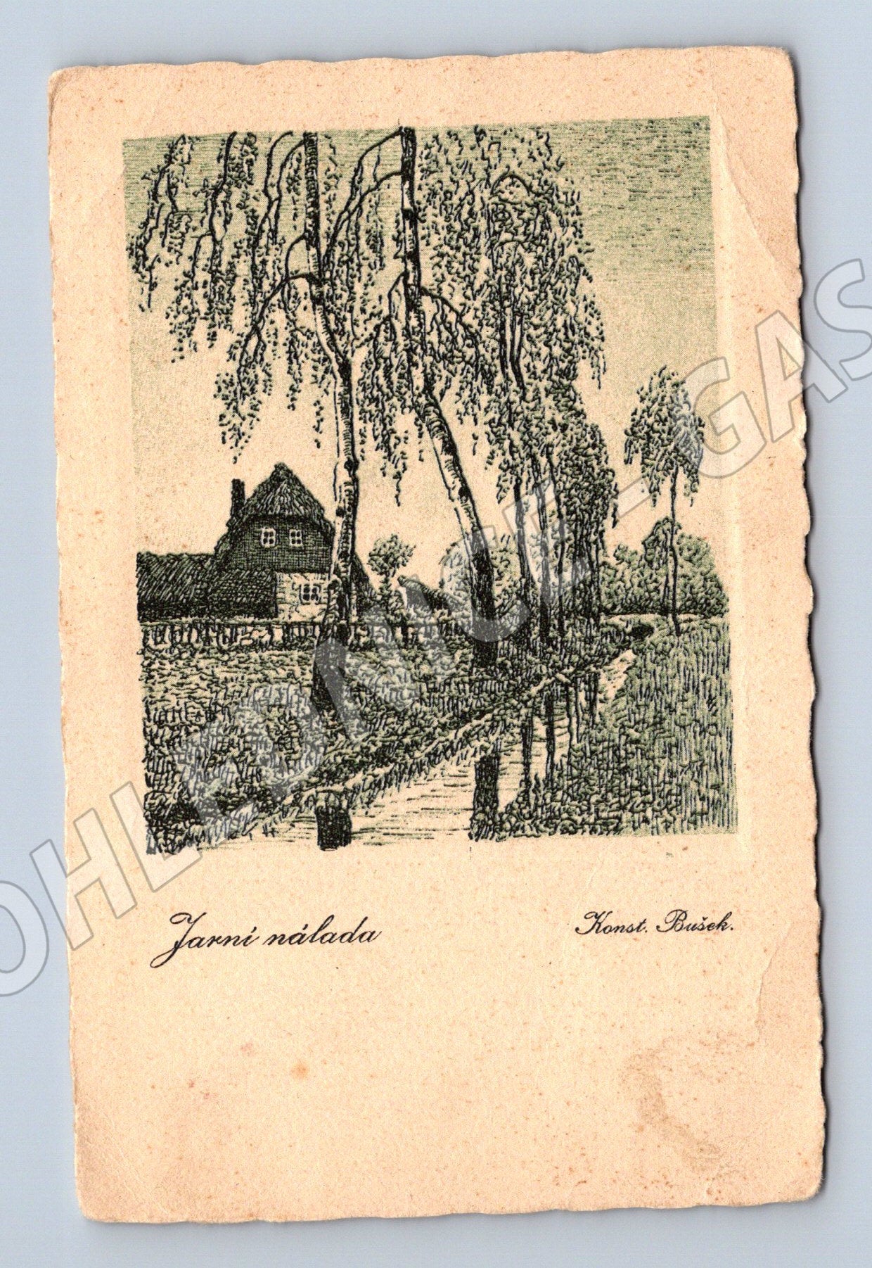 Originální stará pohlednice s názvem Jarní nálada od autora Karel Bílek. Pohlednice zobrazuje typickou českou krajinu s domkem, stromy a polem v jarní atmosféře, kresba je provedena technikou černobílého tisku. Okraje pohlednice jsou zvlněné, což dodává pohlednici dobový vzhled. Pohlednice není použitá a její zadní strana je čistá, určena pro adresu a známku. Výborný sběratelský kus pro milovníky české krajiny a starých pohlednic. Stav odpovídá stáří, viz foto.
