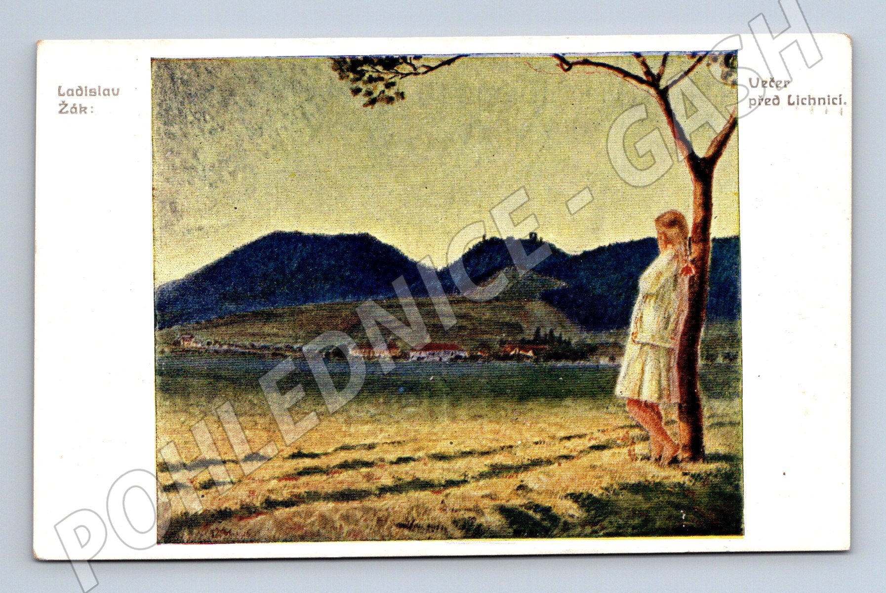 Originální stará pohlednice s názvem Večer před Lichnicí od výtvarníka Ladislava Žáka. Pohlednice zobrazuje romantickou krajinu s dívkou opřenou o strom a dominantní siluetou hradu Lichnice v krajině České republiky. Pohlednice je použitá, na zadní straně je adresována slečně Zdence Kryslíčkové do Hradce Králové. Vydavatel: Kartinka Praha. Rozměr klasického malého formátu. Vhodné pro sběratele pohlednic s motivy českých hradů, krajiny a historických míst.