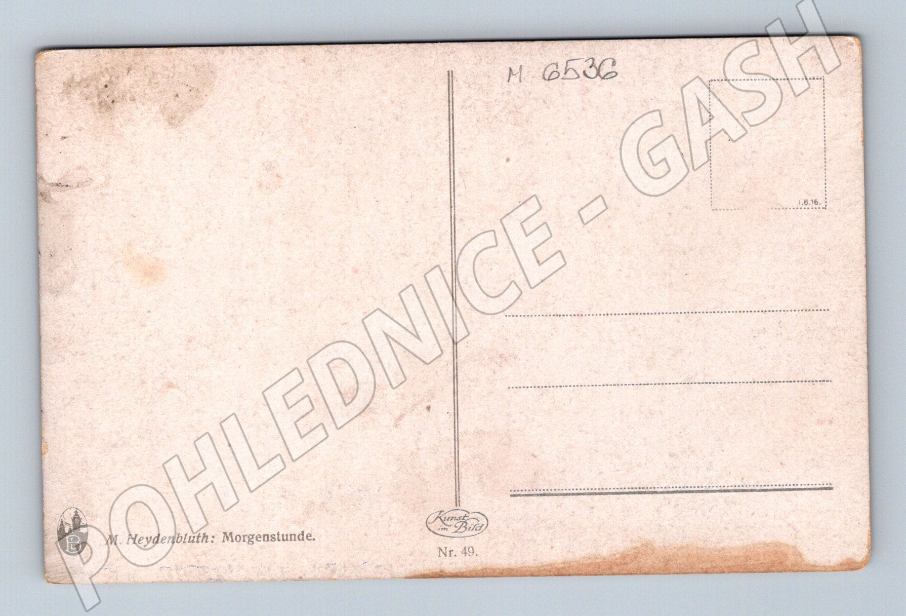 Starší umělecká pohlednice s motivem ženy sedící u okna a čtoucí si či píšící za ranního světla. Autorem předlohy je malíř M. Heydenbluth, dílo nese název Morgenstunde . Pohlednice má klasický nedělený/reversní rub pro napsání adresy a sdělení. Celkově je ve velmi dobrém stavu, pouze drobné opotřebení rožků a lehké zašpinění na zadní straně odpovídající stáří. Krásný sběratelský kus vhodný do kolekce historických uměleckých pohlednic nebo jako dekorace.