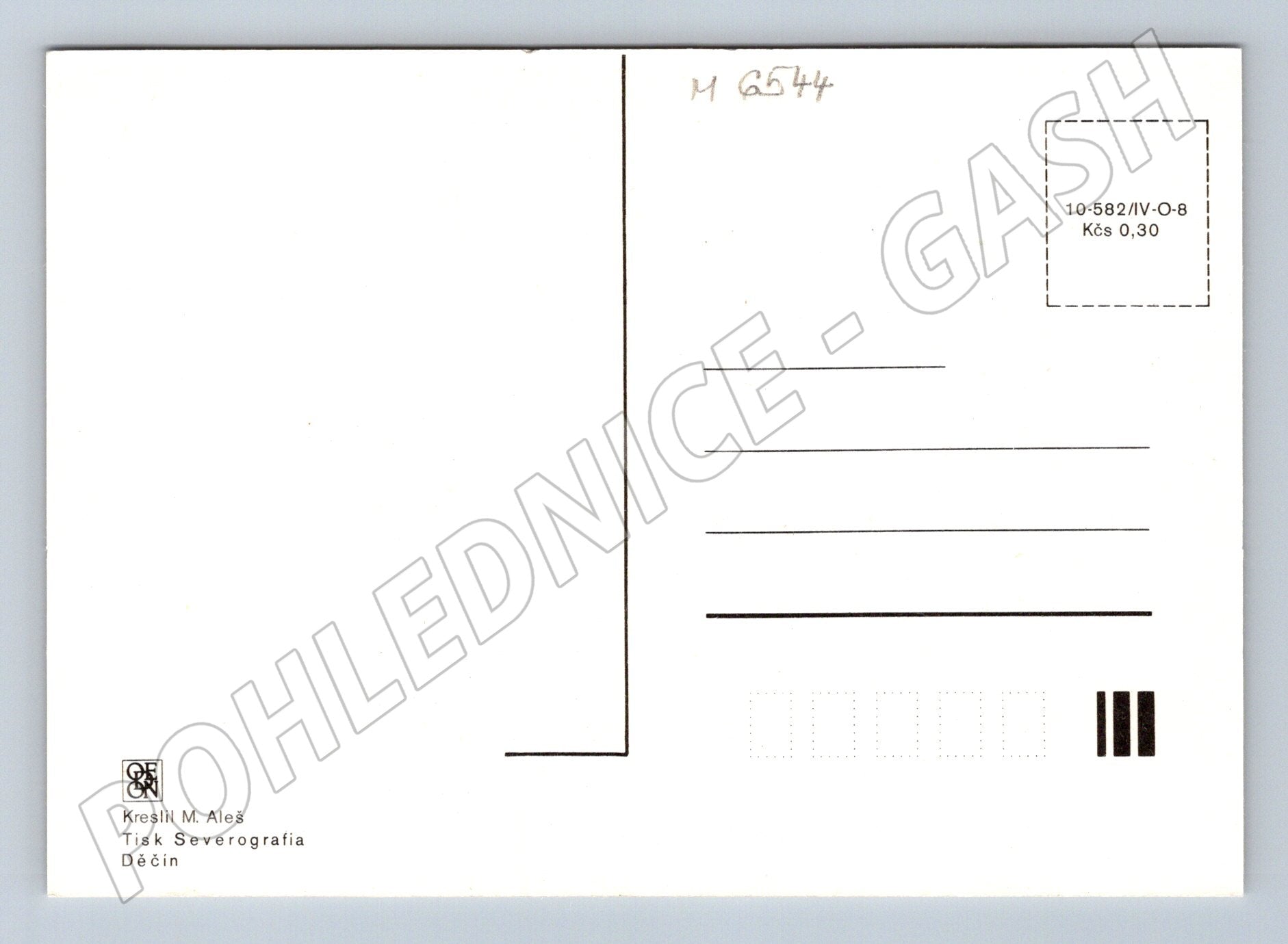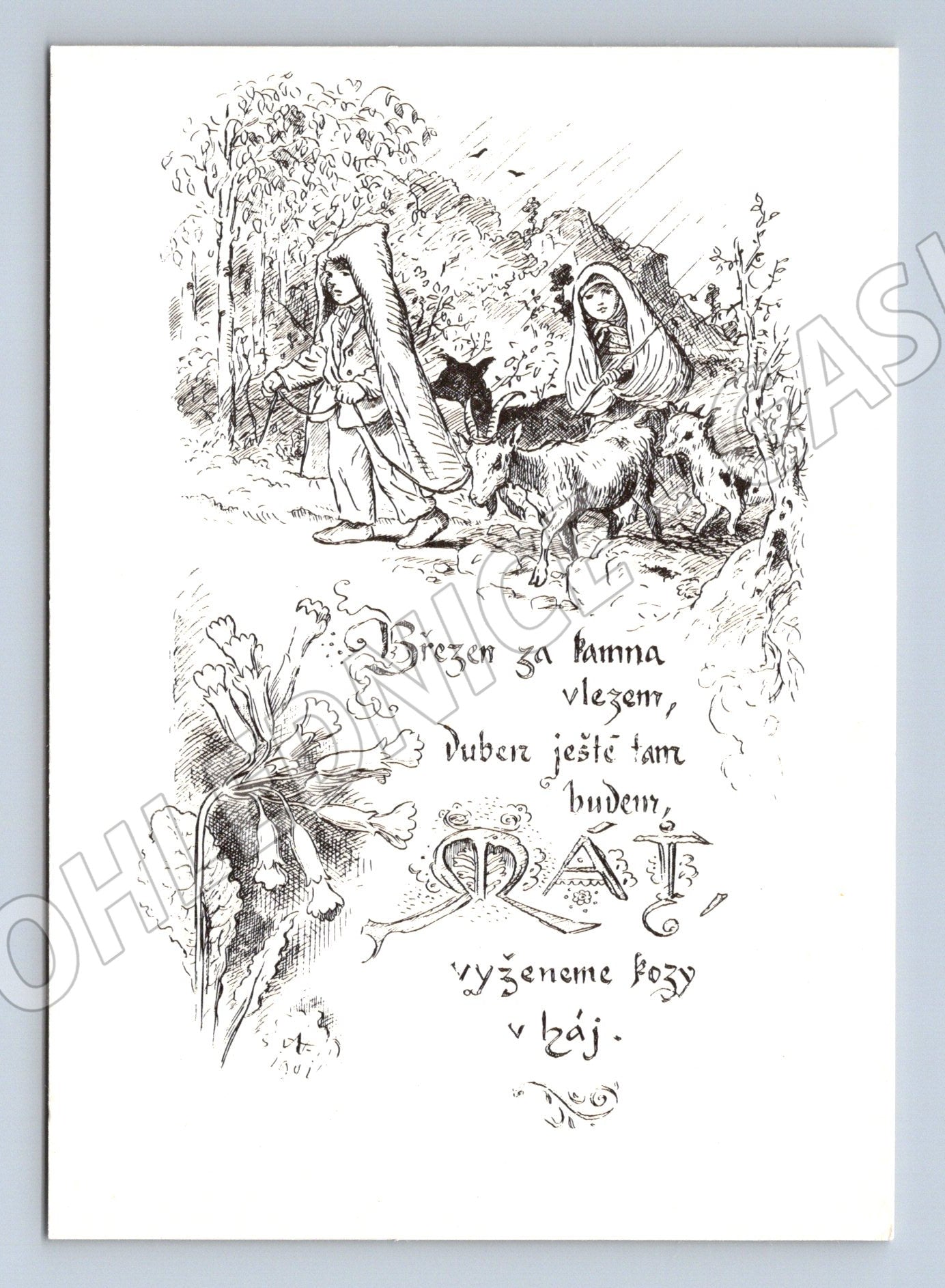 Pohlednice s uměleckou kresbou od Mikoláše Alše. Na přední straně je černobílá ilustrace s motivem vesnické dívky a koz u lesa, doplněná stylizovaným českým nápisem „Pozor za kamna vlezem, duben ještě tam budem. Vyženeme kozy v háj.“. Zadní strana je neprošlá, s vyznačeným místem pro známku a adresu, v dolním rohu uvedeno: Kreslil M. Aleš, tisk Severografia Děčín. Výborný sběratelský stav, čistá bez známek použití. Ideální pro sběratele pohlednic s uměleckými motivy a českými ilustrátory.