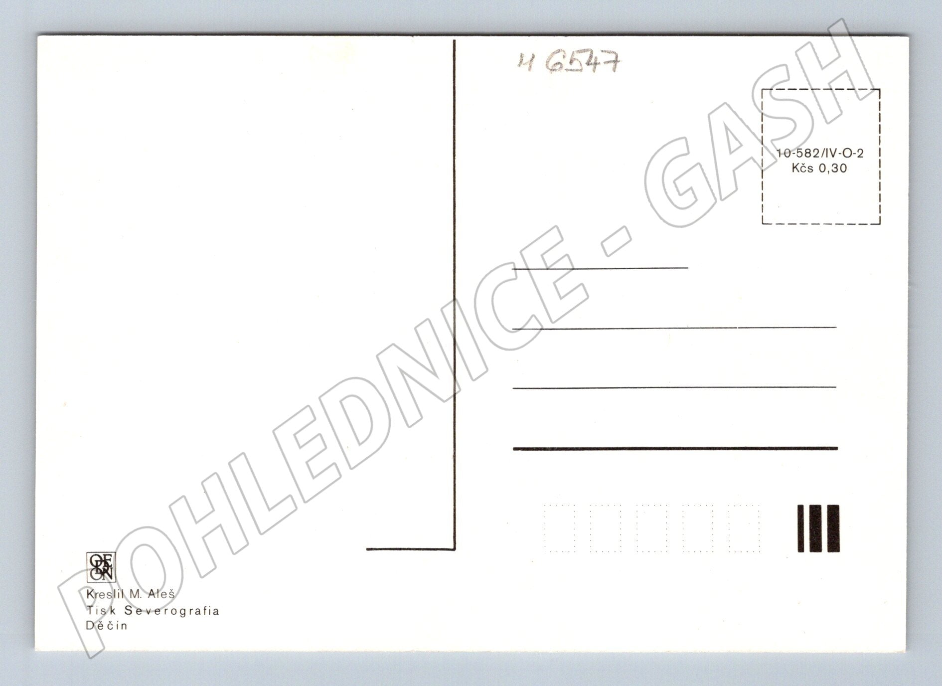Originální pohlednice s kresbou Mikoláše Alše. Na přední straně je nádherná černobílá ilustrace s verši od Lžičeckého, motiv zřejmě inspirovaný českým folklórem. Jedná se o uměleckou pohlednici vytištěnou tiskem Severografia Děčín, určena pro sběratelské účely i jako dekorativní předmět. Pohlednice je nepopsaná, ve velmi dobrém stavu, rubová strana čitelná s vyznačením pro známku a adresu. Skvělý doplněk do sbírky pohlednic s uměleckými motivy nebo ilustracemi slavných českých malířů.