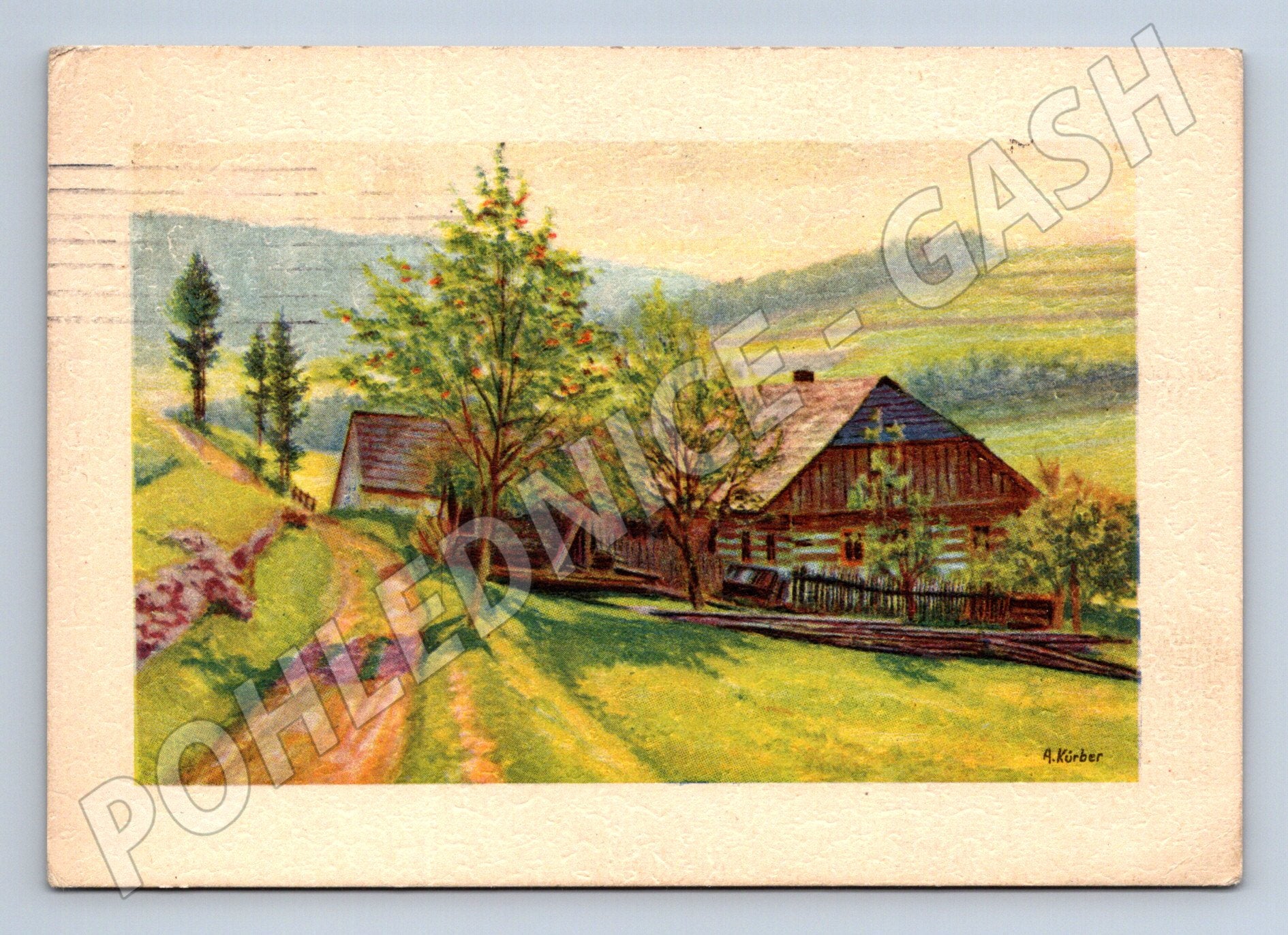 Originální malovaný motiv české chalupy na venkově v krásné letní krajině. Pohlednice byla odeslána v roce 1966, na zadní straně razítko a známka Československo 30 h (hrad Pernštejn). Na rubu je ručně psaný vzkaz a adresa. Pohlednice je ve velmi dobrém stavu, pouze drobné známky stáří a oběhu. Rozměr zhruba odpovídá klasickému malému formátu. Ideální přírůstek do sbírky historických českých pohlednic s venkovskými motivy.