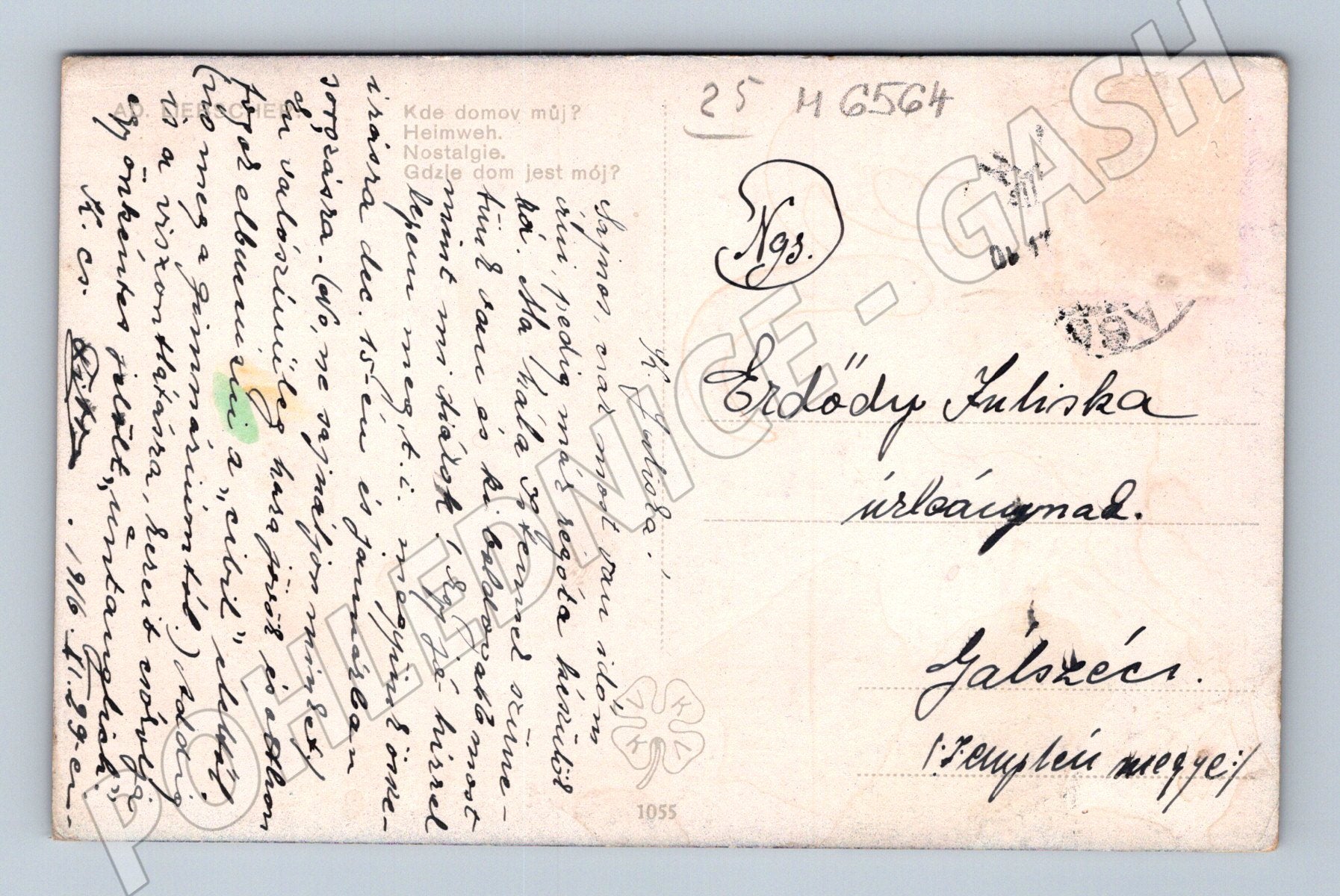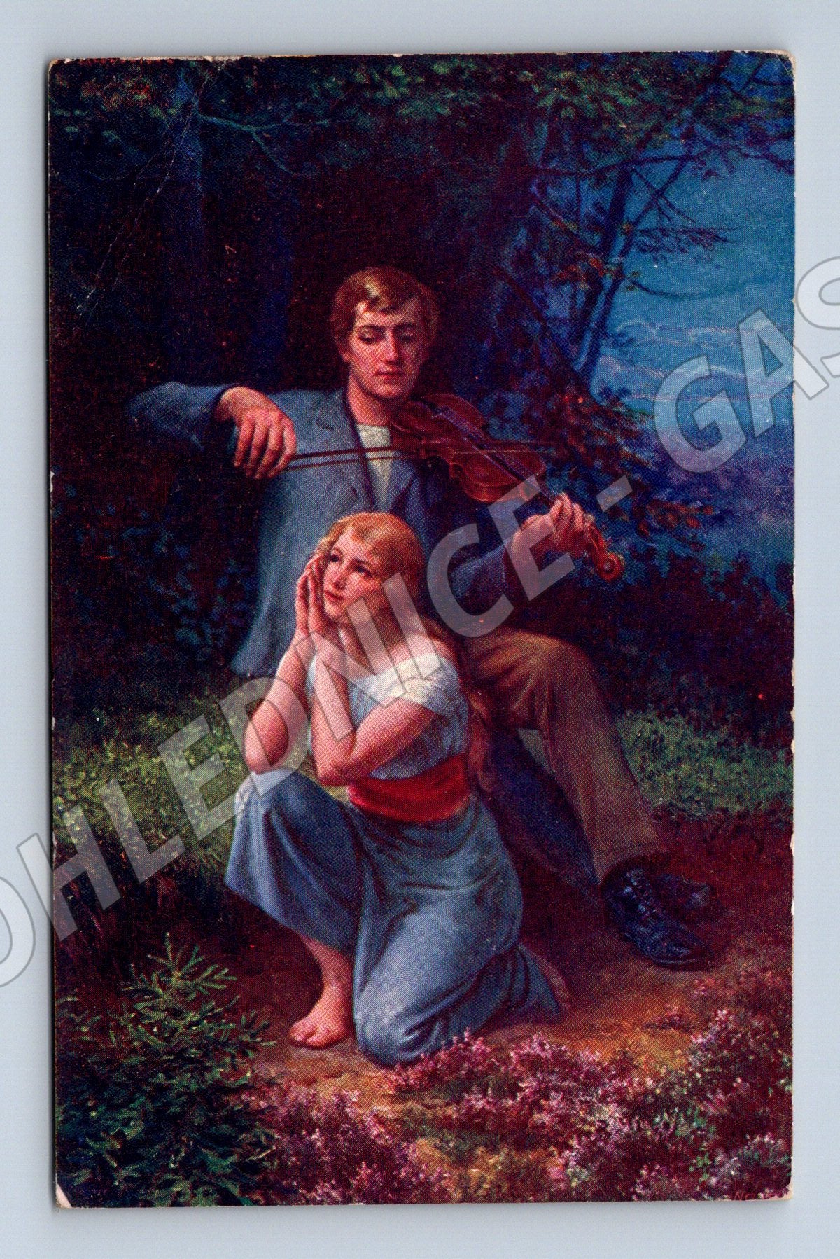 Starší pohlednice s malířským motivem – dvojice v přírodě, muž hrající na housle a dívka sedící opřená o jeho nohy. Atmosférické večerní osvětlení, výjev romantického až pastorálního rázu, charakteristické pro konce 19. a začátek 20. století. Rubová strana doplněna ručně psaným textem, známkou i razítkem. Vhodné do sbírky uměleckých pohlednic, dokumentující dobovou estetiku a nálady. Stav dle foto, mírné opotřebení, dobrý sběratelský kus.