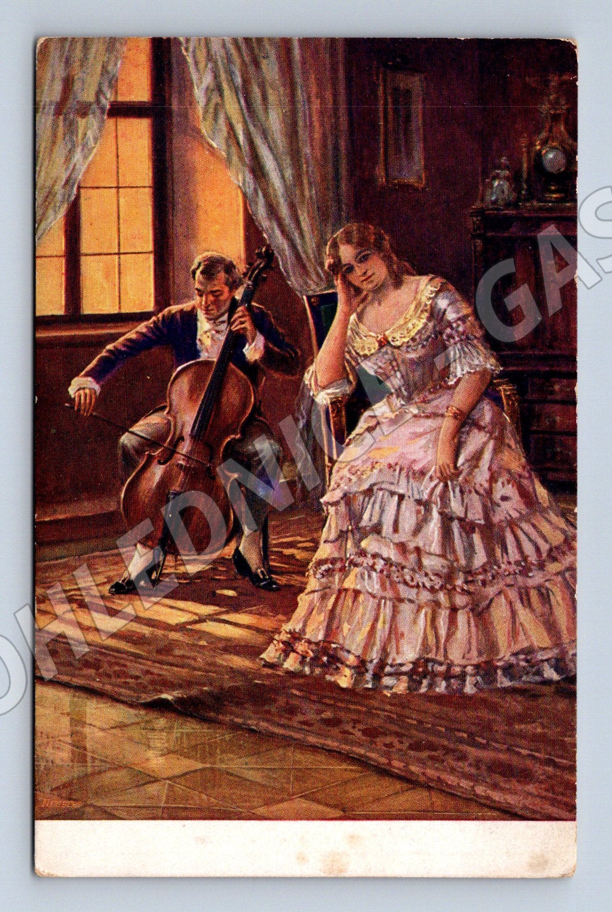 Historická pohlednice s názvem Píseň touhy (Lied der Sehnsucht) od malíře C. V. Mutticha. Na umělecké kresbě je zachycen romantický interiér s mladou elegantní dámou v nádherných šatech, sedící zasněně u stolu, a mužem hrajícím na violoncello. Jemně barevná pohlednice skvěle zachycuje atmosféru touhy a nostalgie. Nepopsaná, stav viz foto – drobné známky stáří a lehké opotřebení. Vhodná pro sběratele historických a uměleckých pohlednic.