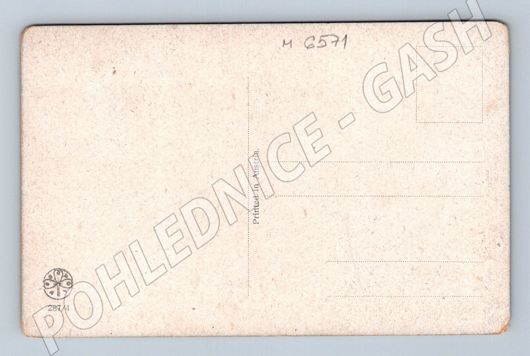 Originální stará pohlednice s malovaným motivem vesnické krajiny. Na přední straně je zobrazen malý domek obklopený stromy, po cestě jde postava muže s holí a brašnou. Pohlednice má pěkné barevné provedení, je neprošlá a na zadní straně je označení Printed in Austria a číselné označení 287/4. Stav je odpovídající stáří – mírné opotřebení rohů, nečistoty na zadní straně, drobné oděrky. Velmi dekorativní sběratelský kousek vhodný do sbírky historických pohlednic s malovanými motivy.