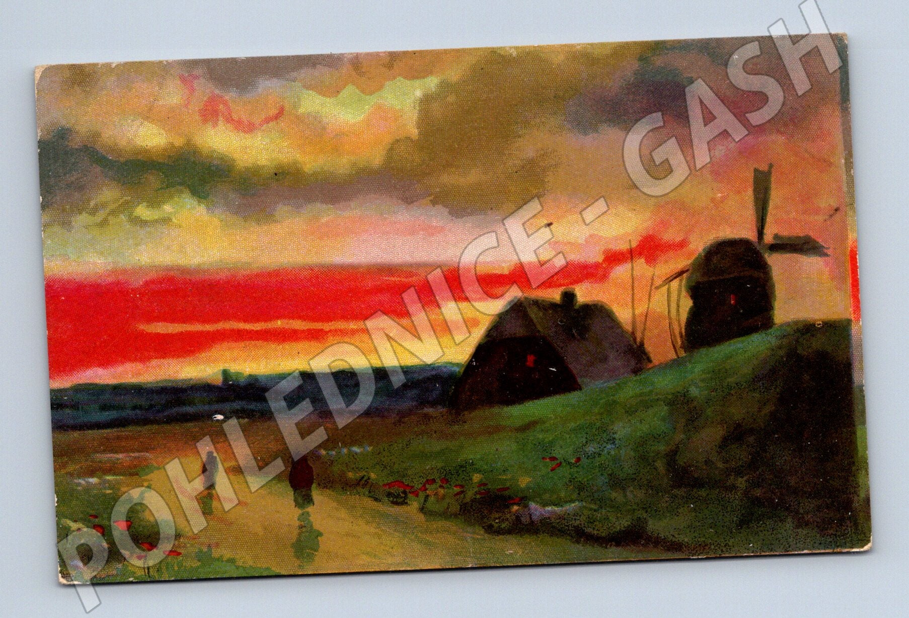 Nabízím originální malovanou pohlednici s motivem malebné venkovské krajiny se siluetou větrného mlýna za soumraku. Pohlednice zachycuje dvě postavy na cestě vedoucí kolem polí a květin směrem k domům a mlýnu na kopci. Krásné syté barvy západu slunce vytvářejí dramatickou atmosféru celé scény. Zadní strana je neprošlá a opatřená mezinárodním označením pro pohlednice v několika jazycích. Skvělý sběratelský kousek pro milovníky umění a nostalgických krajin.