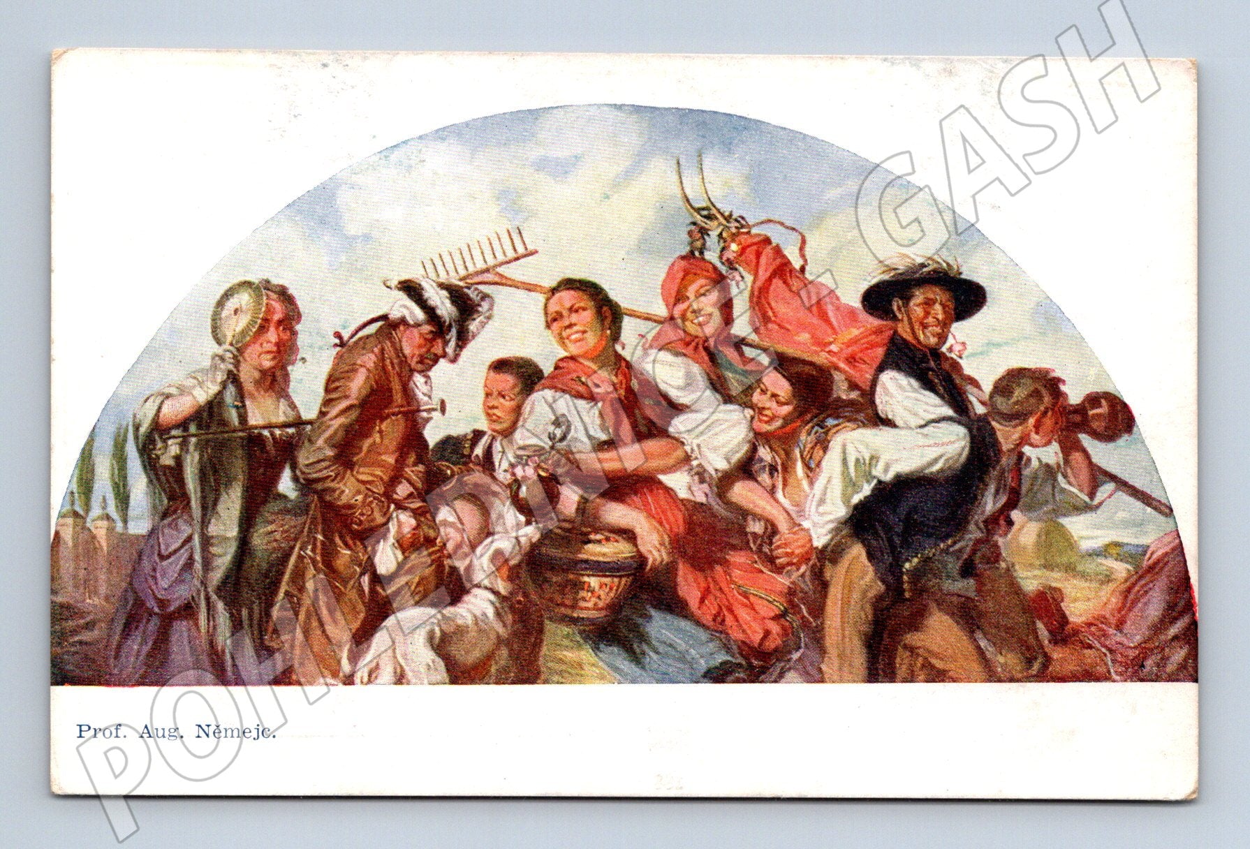 Nabízím krásnou pohlednici s etnografickým motivem od známého malíře Prof. Augusta Němejce. Na lícové straně pohlednice je zobrazen tradiční venkovský výjev s veselými postavami v krojích, patrný je detail folklórního života českého venkova v minulých stoletích. Charakteristický je dynamický a barevný malířský styl autora. Pohlednice je vydána nakladatelstvím Minerva, na zadní straně je neprošlá poštou, pouze s katalogovým číslem. Pohlednice má mírné opotřebení odpovídající stáří (viz foto). Skvělý sběratelský kousek pro milovníky české historie a tradic!