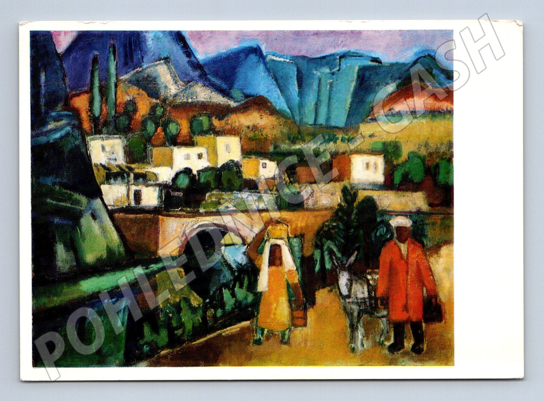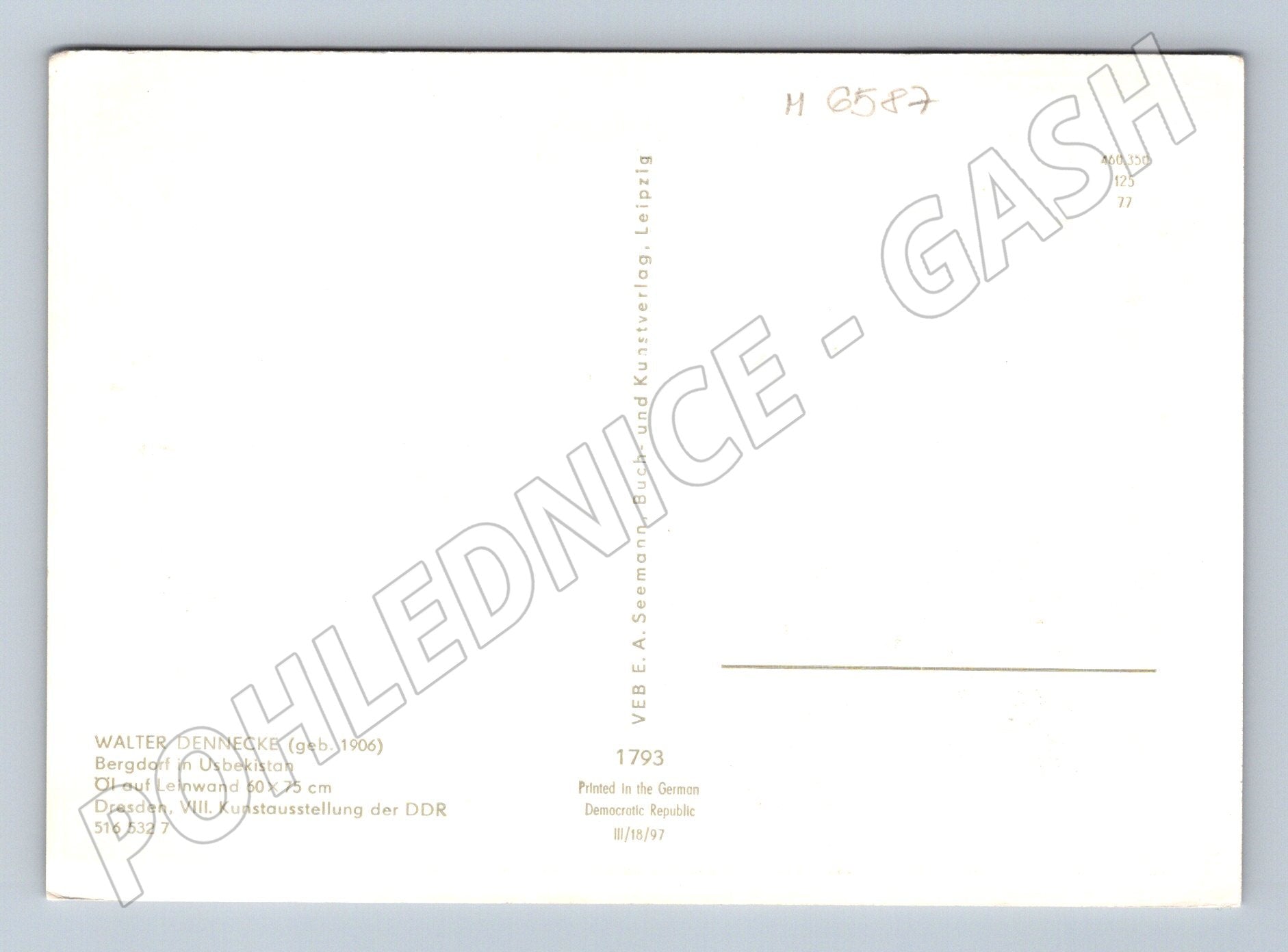 Originální stará pohlednice s reprodukcí obrazu od německého malíře Waltera Denneckeho (nar. 1906) s názvem Bergdorf in Usbekistan (Horská vesnice v Uzbekistánu). Olej na plátně, rozměry originálu 60 x 75 cm. Pohlednice byla vydána v Německé demokratické republice při příležitosti VIII. umělecké výstavy v Drážďanech. Na přední straně je barevná reprodukce s horskou scenérií, mostem, osadou a postavami v orientálním stylu. Zadní strana je čistá, pouze s popisem a údaji o autorovi. Skvělý přírůstek do sbírky pohlednic s malířskými motivy nebo umělecké grafiky.