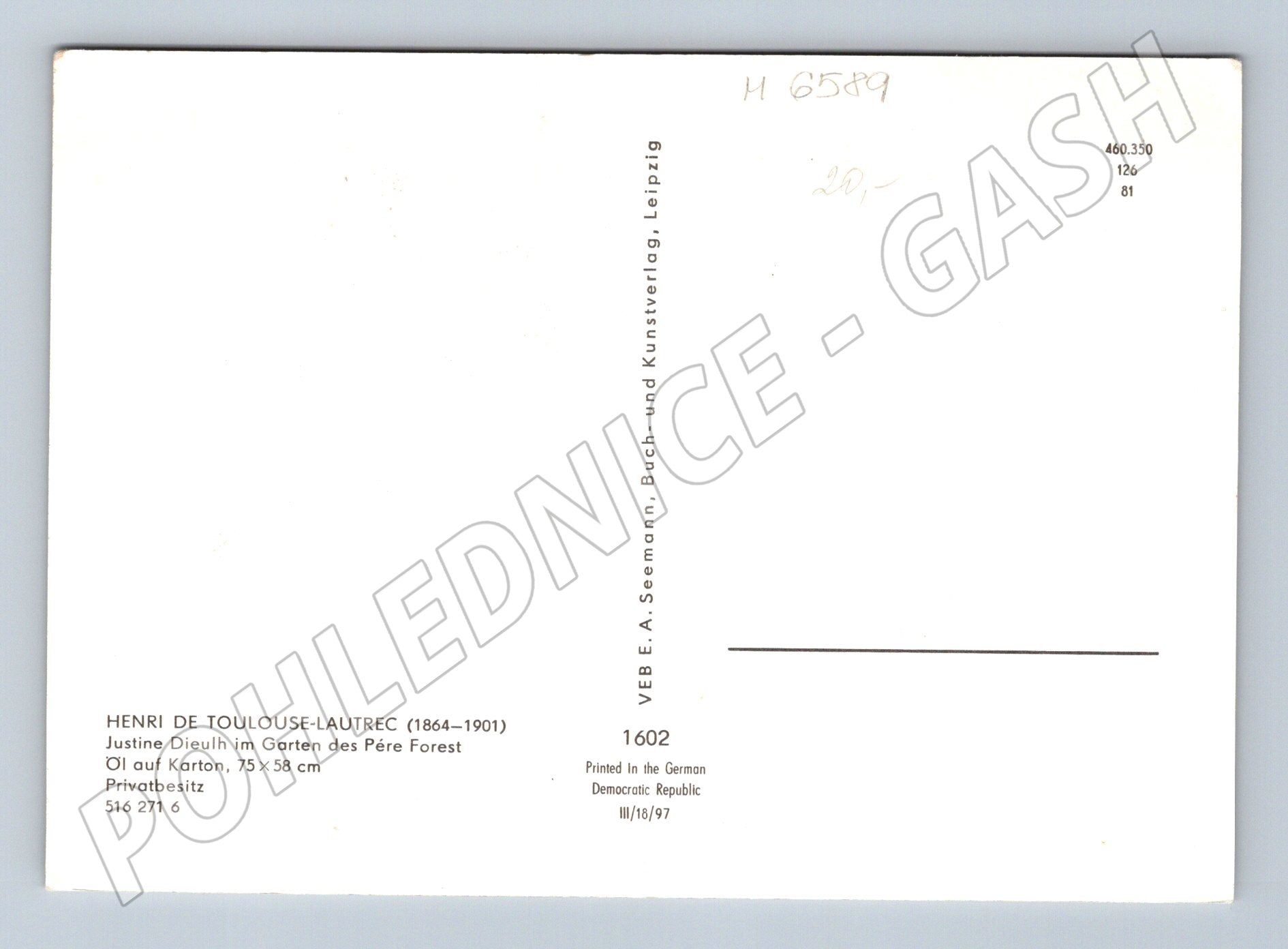 Pohlednice s reprodukcí obrazu slavného francouzského malíře Henriho de Toulouse-Lautreca (1864–1901) s názvem Justine Dieulh im Garten des Père Forest . Olej na kartonu, 75 x 58 cm, v soukromém vlastnictví. Pohlednice vydala VEB A. Seemann, Buch- und Kunstverlag Leipzig. Nápis v němčině, tištěno v NDR, č. 1602. Zadní strana je nepopsaná, ve velmi pěkném stavu. Skvělý sběratelský kousek pro milovníky výtvarného umění a impresionismu.