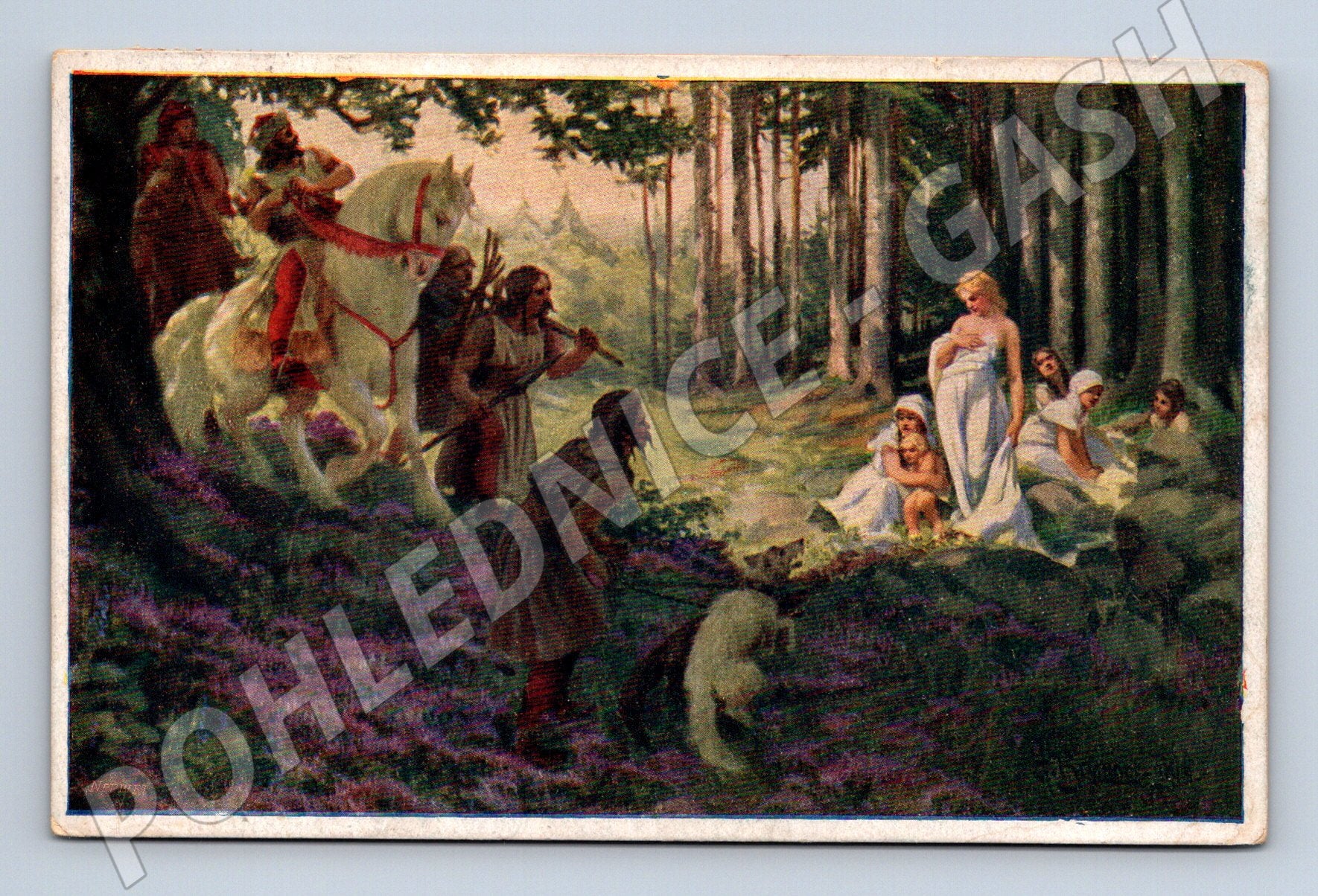 Originální stará pohlednice s uměleckým motivem z české historie – setkání Oldřicha a Boženy, dle slavného obrazu malíře A. Brunnera. Pohlednice je malého formátu, používaná, s poštovními známkami a adresou odeslanou do Berlína. Na lícové straně detailně vyvedená kresba zachycuje scénu v lesním prostředí s několika postavami v tradičním šatu, včetně jezdce na koni. Pohlednice je vhodná pro sběratele historických pohlednic a milovníky české historie. Stav odpovídá stáří, drobné opotřebení hran, značky používání. Výjimečný sběratelský kus.