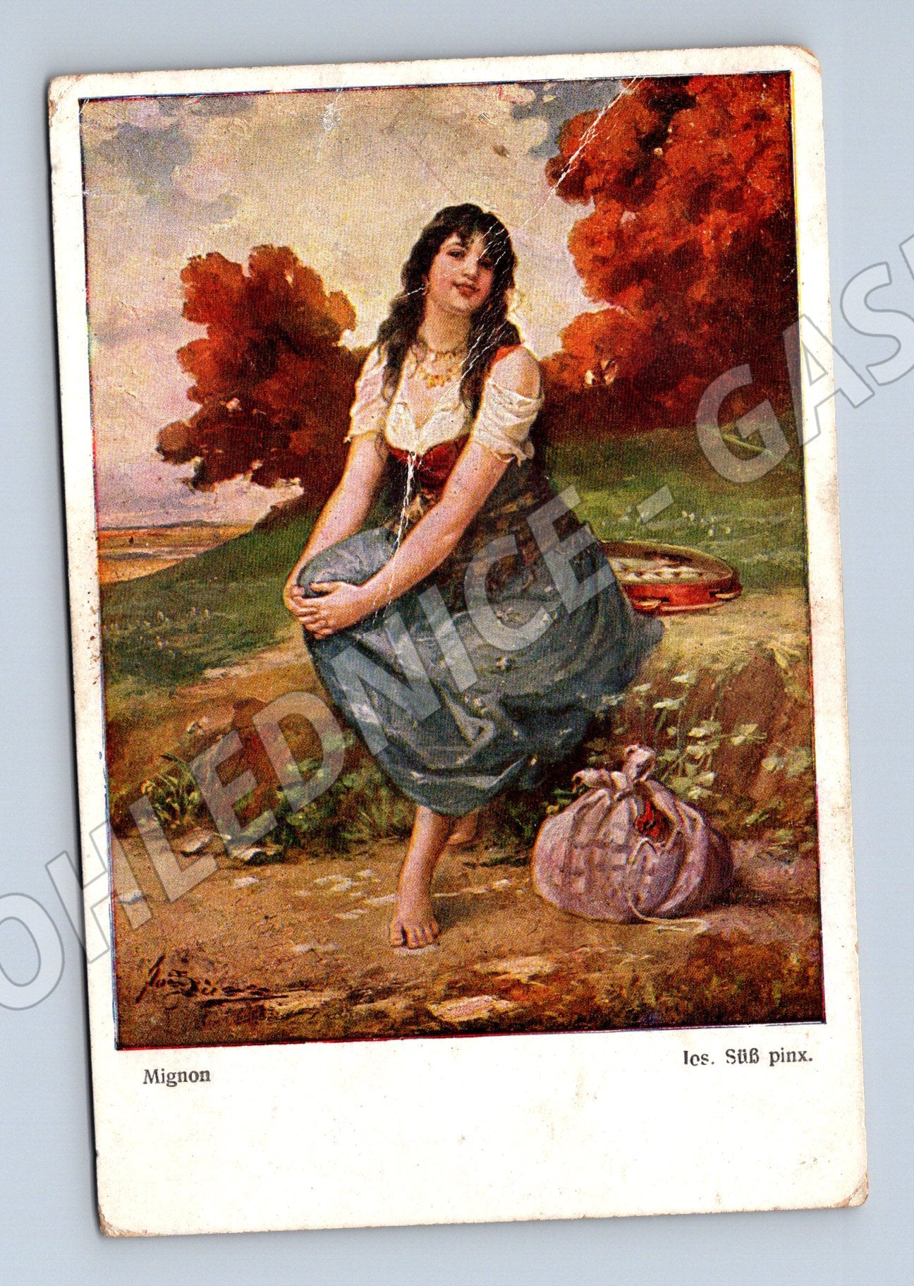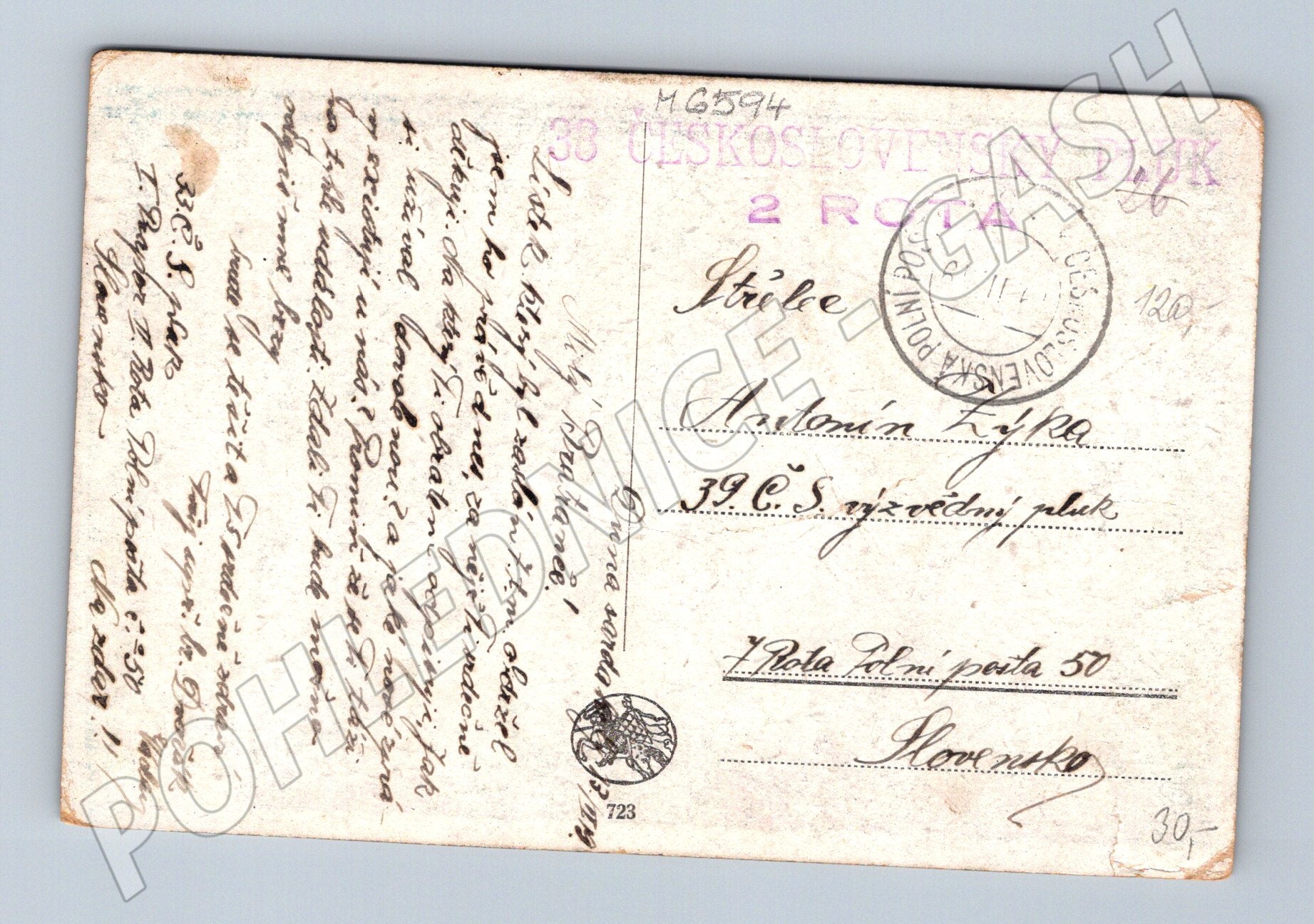 Originální stará pohlednice vyobrazující dívku v tradičním lidovém kroji. Pohlednice nese název Mignon , je zdobena barevnou malbou se silnými etnografickými prvky a atmosférou venkova. Zadní strana je popsána ručně psaným textem a obsahuje poštovní razítka a známky polní pošty, což dodává pohlednici jedinečný historický charakter. Pohlednice byla adresována slovenskému adresátovi a je vhodná zejména pro sběratele pohlednic s etnografickou nebo vojenskou tematikou či sběratele korespondence z období první poloviny 20. století. Stav viz foto, mírné opotřebení odpovídající stáří. 38 ČESKOSLOVESNKÝ PLUK 2 ROTA