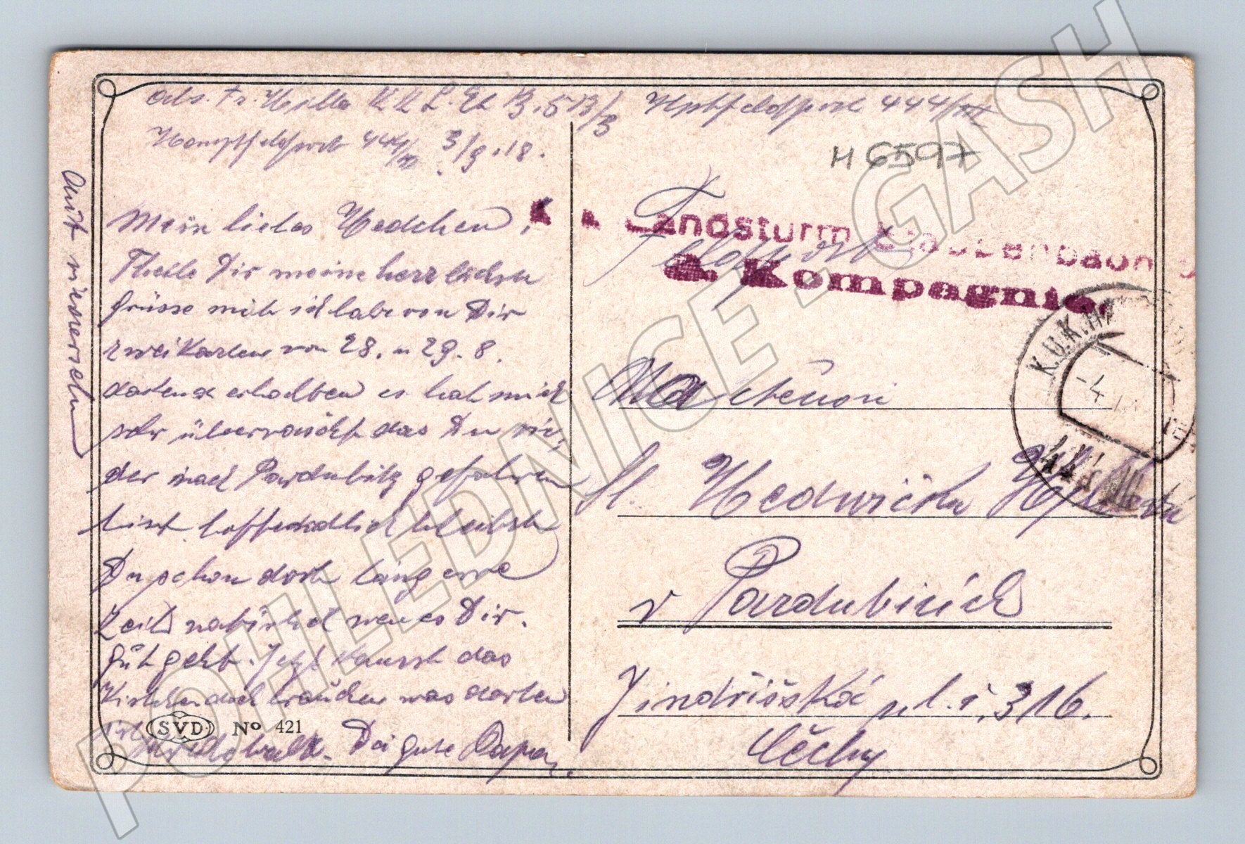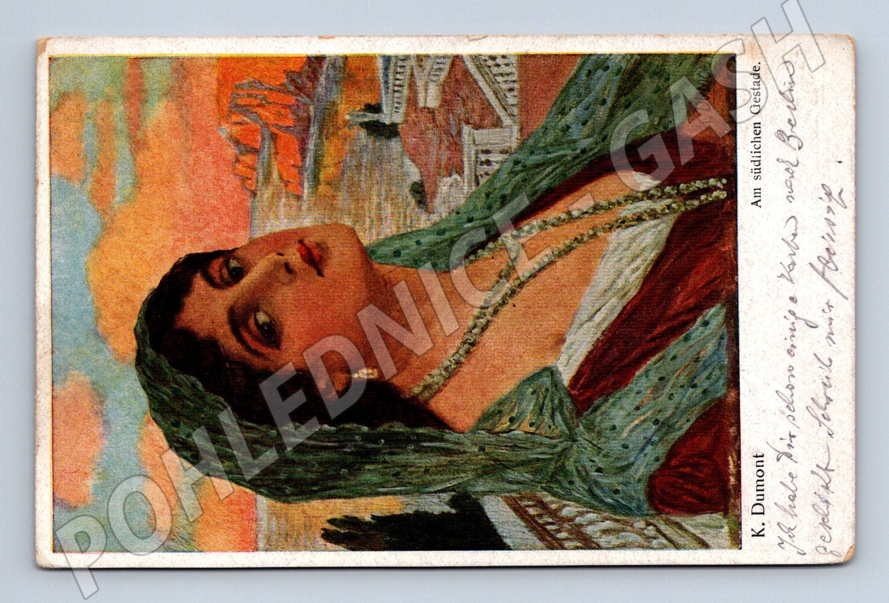 Originální historická pohlednice s malovaným portrétem ženy od K. Dumonta, motiv Am städtischen Gestade. Pohlednice má na zadní straně ručně psaný text a poštovní razítko. Datace podle použitého textu a razítka kolem roku 1918. Stav odpovídá stáří – mírně opotřebené okraje, ručně psaný text a známky poštovního provozu. Vhodné pro sběratele historických i uměleckých pohlednic, zajímavý motiv ženy ve výrazných barvách. K.u.k. Landsturm 513/3 feldpost 444/ III kompagnie polní pošta