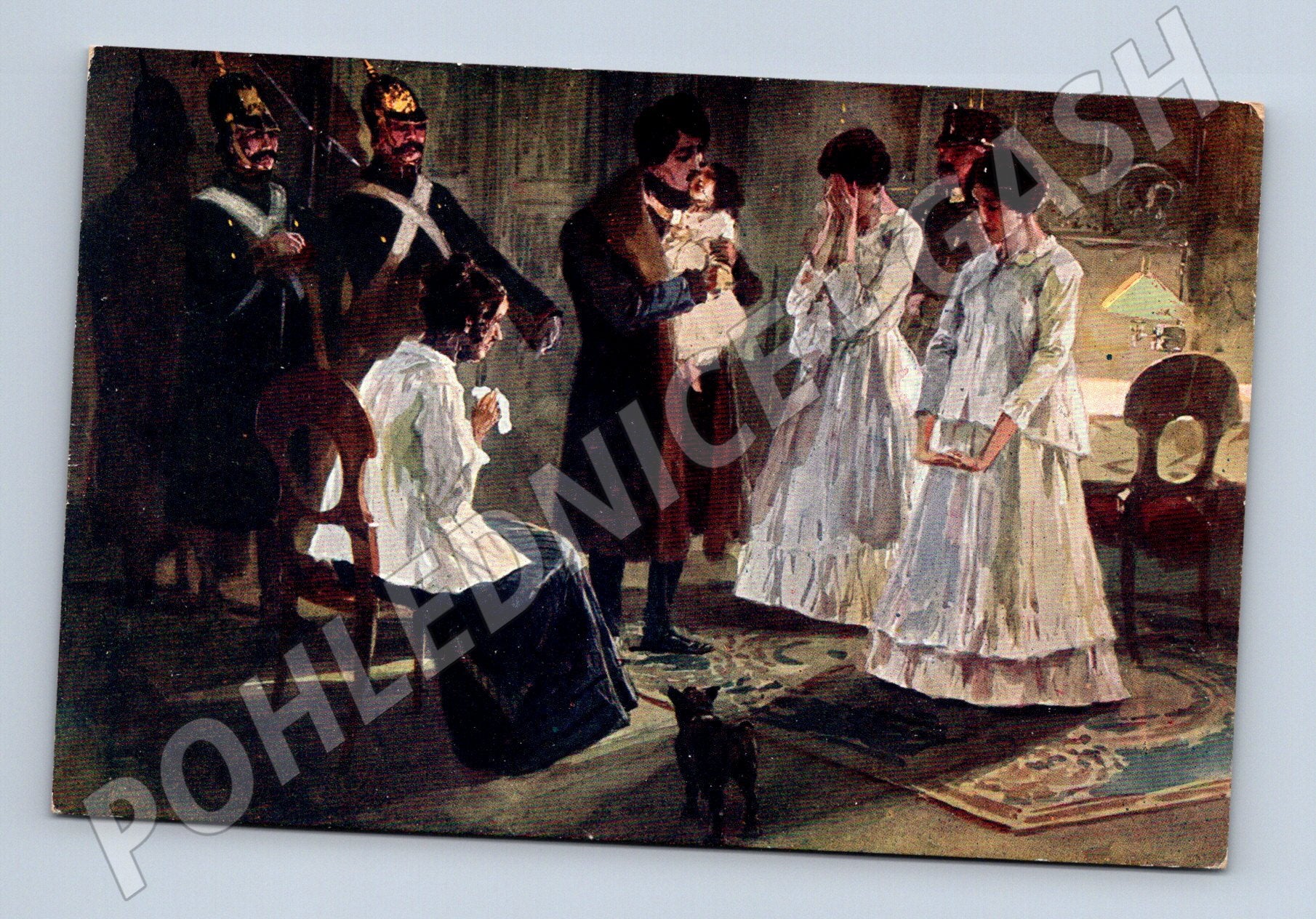 Umělecká pohlednice s názvem Tyrolské elegie . Na přední straně je reprodukce malby zobrazující emotivní rodinnou scénu – několik žen v bílých šatech (matka, manželka, dcera, malá Zdenička) stojí či sedí v místnosti, doprovázeny vojáky v uniformách. Celá kompozice vyjadřuje silné emoce smutku a rozloučení, což je podtrženo také textem na zadní straně pohlednice. Pohlednice pochází z Umělecké dopisnice akad. malíře V. Olivy, vydavatel MK. Na zadní straně najdete báseň a prostor pro adresu a vzkaz. Pohlednice vhodná pro sběratele malířských a historických motivů, případně pro milovníky umělecké korespondence z první poloviny 20. století.