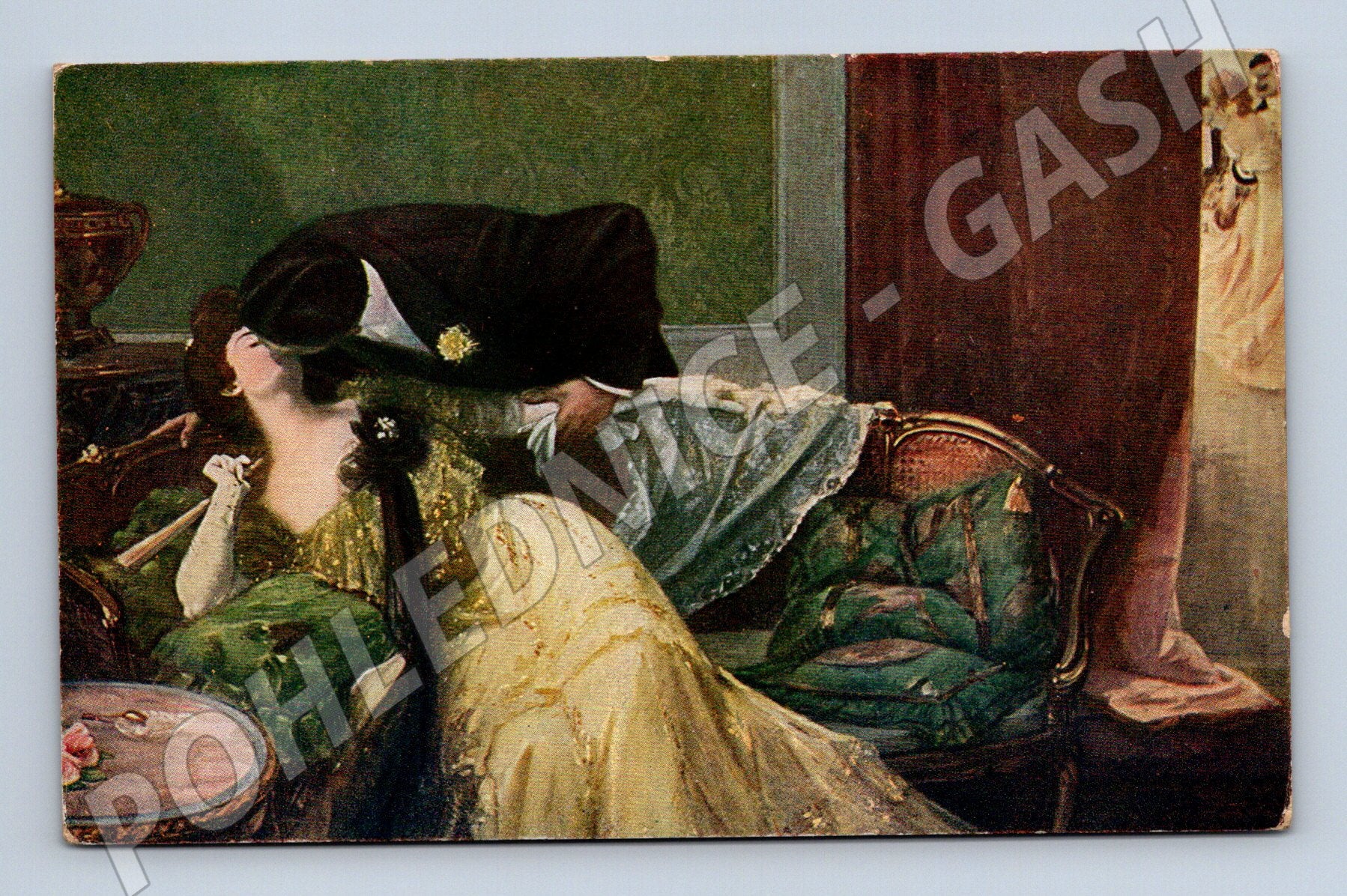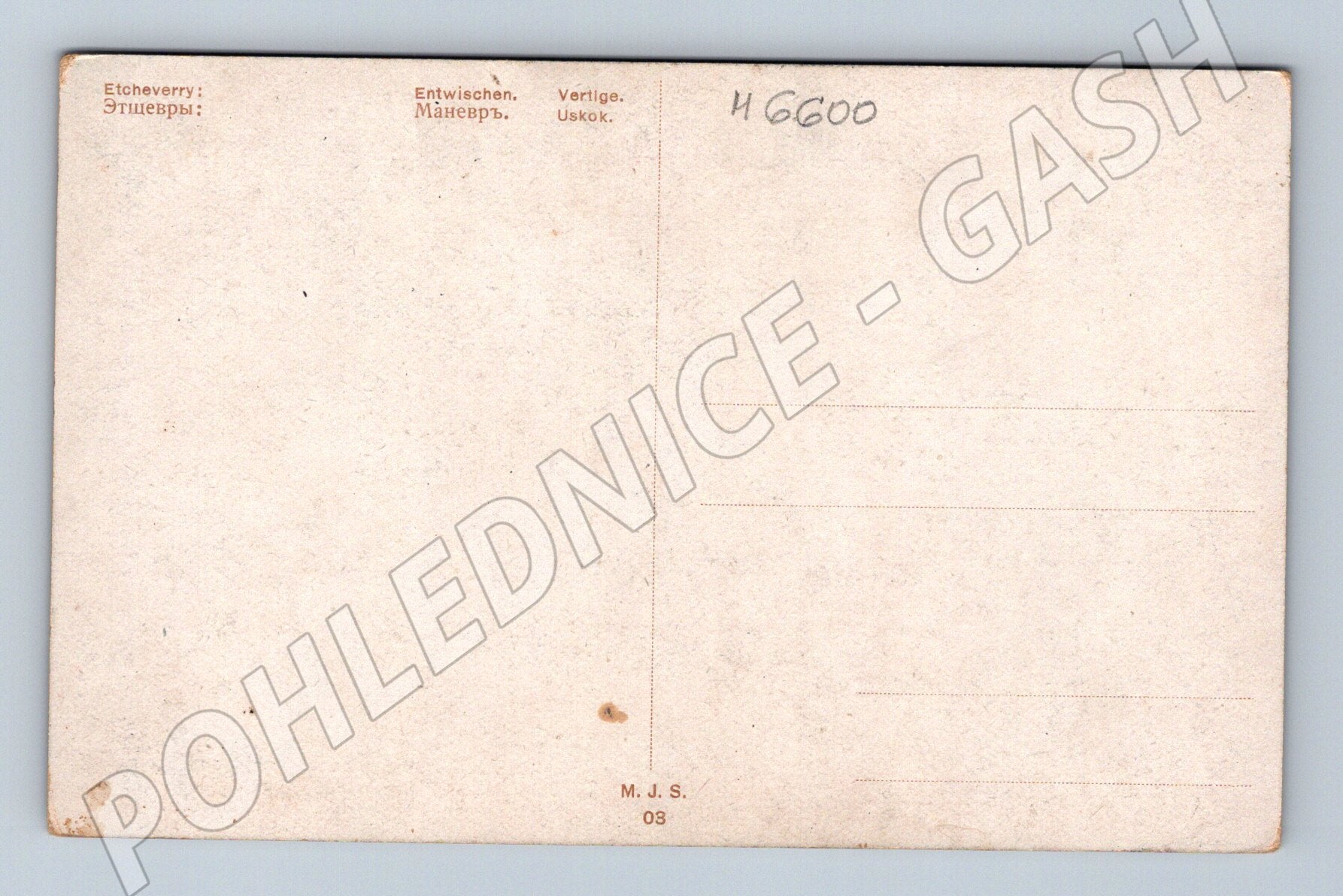 Starobylá umělecká pohlednice s romantickým motivem polibku od malíře Etcheverry. Pohlednice zachycuje elegantní scénu ze salónu, kde je žena v bohatých šatech líbána mužem v historickém kostýmu. Pohlednice má popisky ve více jazycích (včetně ruštiny a němčiny), název díla (např. Entwischen, Manevrь, Vertlige, Uskok) a označení M.J.S. 03. Jedná se o nepopsanou, starožitnou pohlednici s vysokou sběratelskou hodnotou. Možné drobné známky stáří a opotřebení, viz foto.