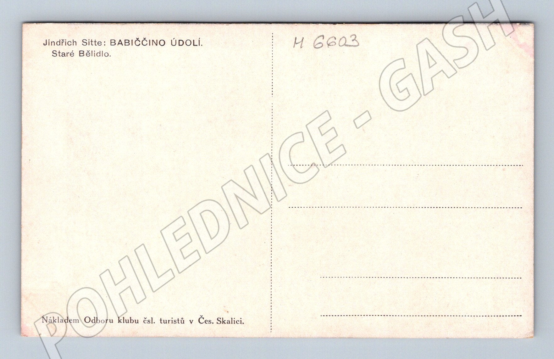 Originální stará pohlednice s motivem malířského ztvárnění Babiččina údolí - Staré Bělidlo od Jindřicha Sitteho. Pohlednice pochází z edice vydané Odborem klubu českých turistů v České Skalici. Na přední straně je umělecká malba krajiny s chalupou ukrytou mezi stromy, na zadní straně informace o autorovi a vydavateli. Výborný stav, pouze mírné opotřebení v rohu. Skvělý sběratelský kousek vhodný do sbírky historických pohlednic nebo pro milovníky českého malířství.