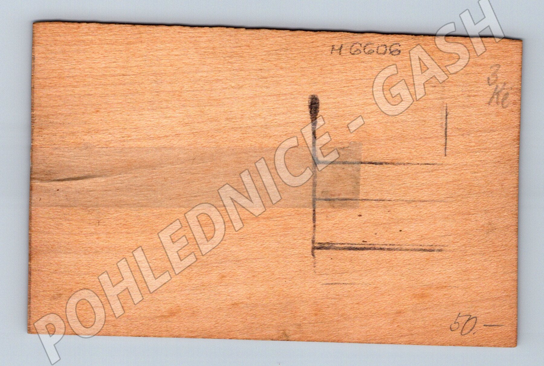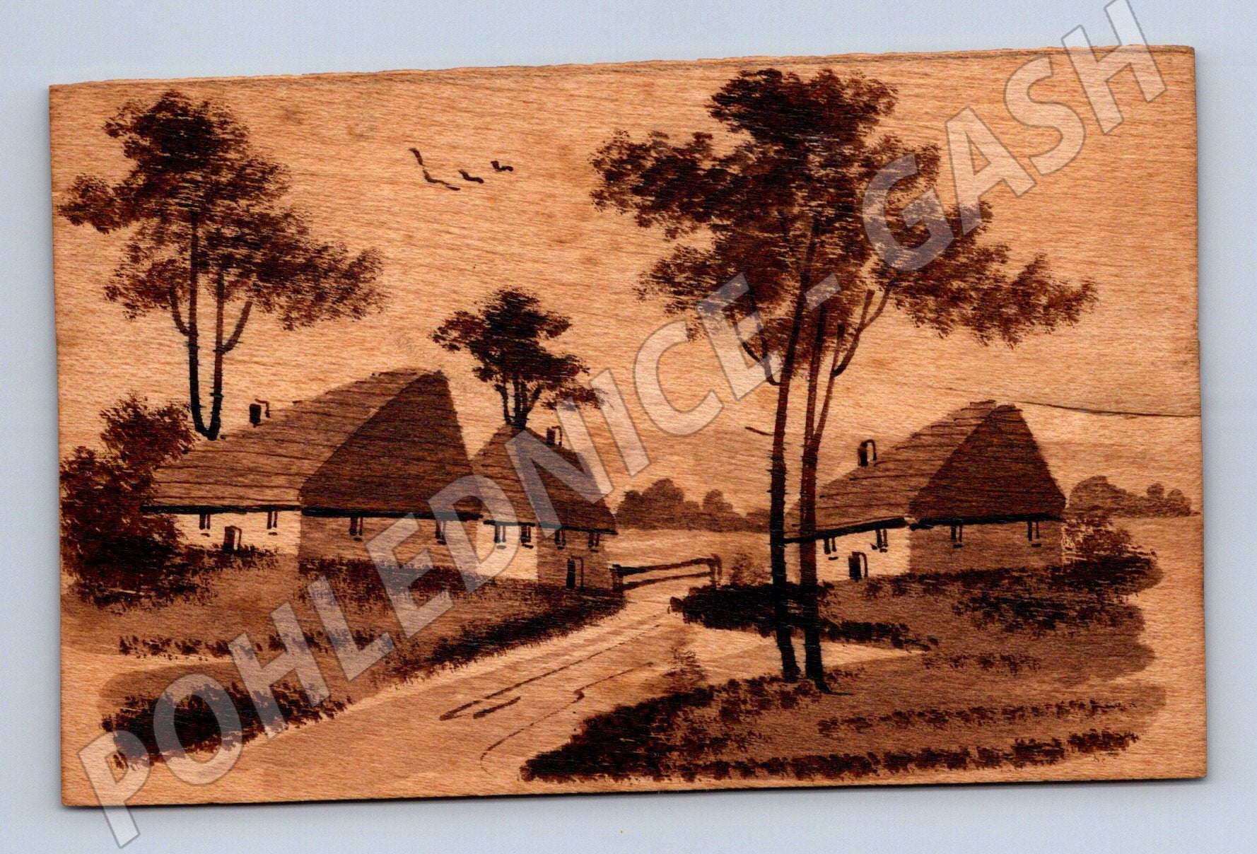 Unikátní stará pohlednice s motivem vesnických chalup a stromů, ručně malovaná na dřevěné překližce. Pohlednice je oboustranná, přední strana zobrazuje malovaný venkovský motiv s chalupami, cestou a stromy na přírodním podkladu dřeva. Zadní strana je určena pro adresu a známku a nese drobné poznámky a razítko. Pohlednice je ve velmi dobrém stavu vzhledem ke stáří. Vhodné pro sběratele nebo jako dekorativní předmět. Formát odpovídá klasické pohlednici. Skvělý sběratelský kousek s jedinečnou atmosférou.