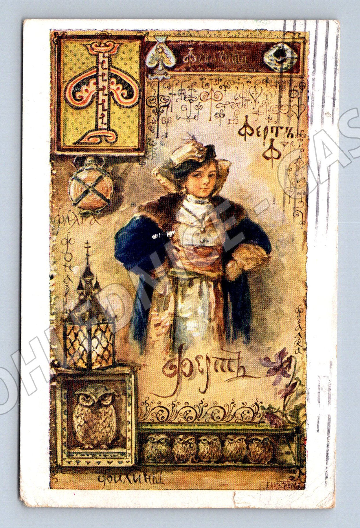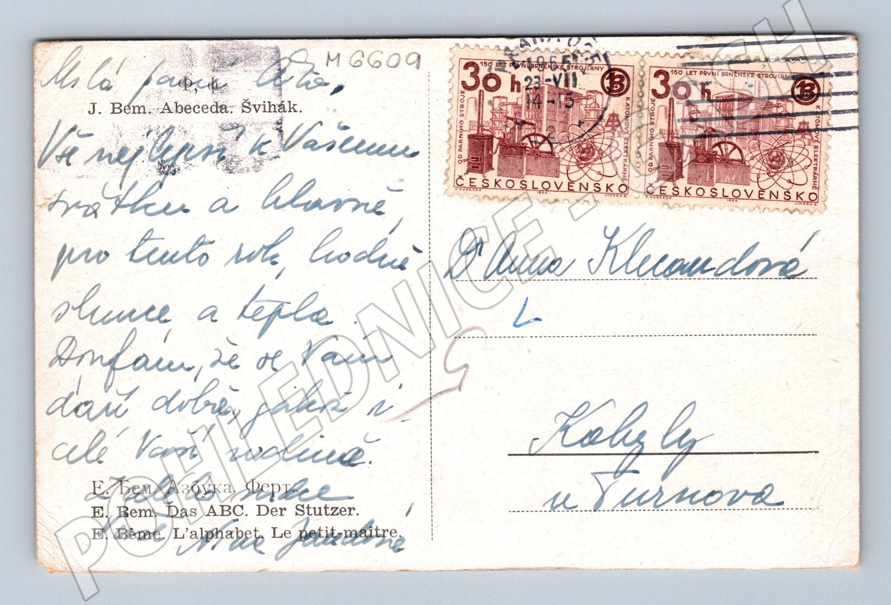 Starší malovaná pohlednice J. Bem - Abeceda. Švihák, použité, známky