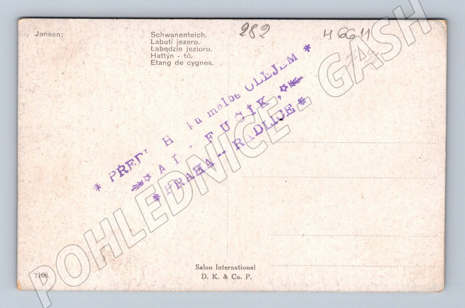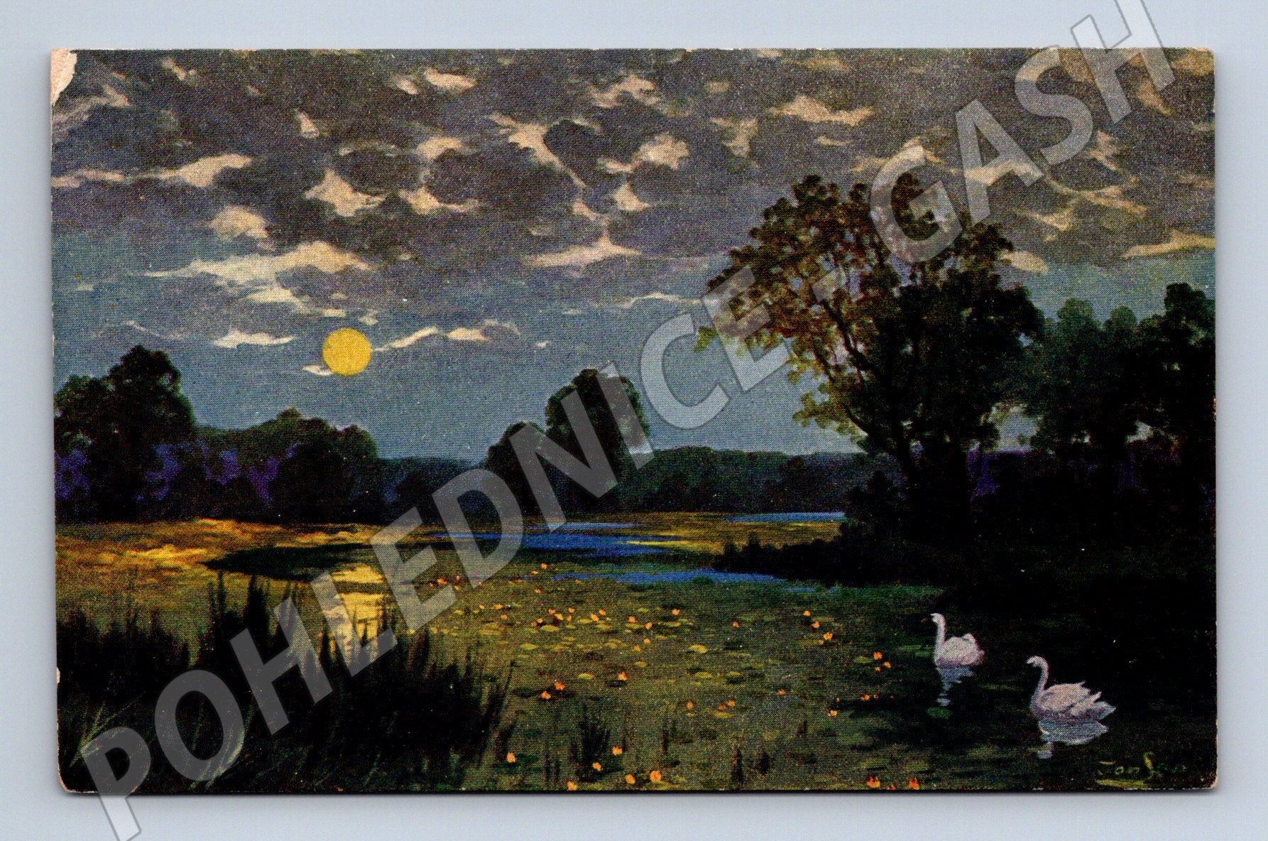 Pohlednice s malovaným motivem labutí na jezeře za měsíčního svitu. Na přední straně je vyobrazena klidná večerní krajina s jezerem, po jehož hladině plují dvě labutě. Scéna je zasazena do přírody, s bohatě zobrazenými stromy a odrazem měsíce na vodní hladině. Na zadní straně pohlednice je uveden vícejazyčný popis motivu (Labutí jezero, Schwanenteich, Łabędzie jezioro aj.), výrobce Salon International D.K.&Co. P. a také je zde razítko nebo podpis. Pohlednice je vhodná pro sběratele žánrových či malovaných pohlednic se zvířaty. Stav viz foto, levý horní roh mírně ohnutý.