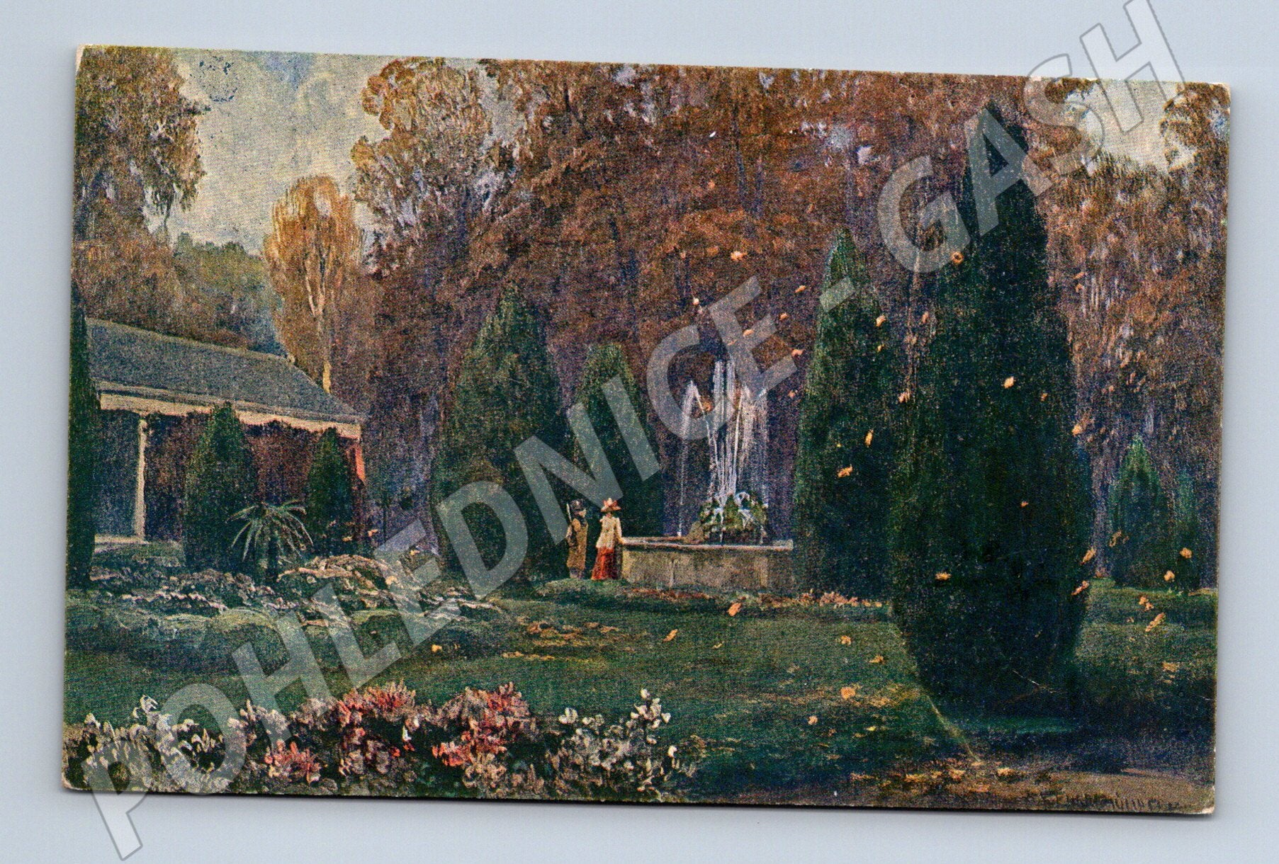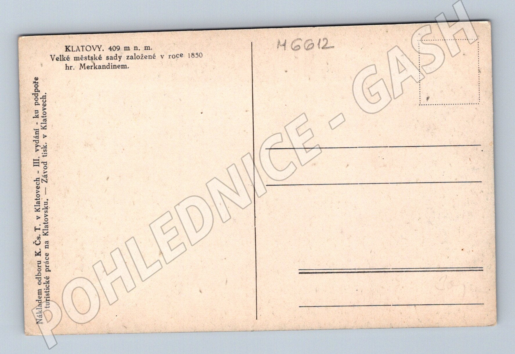 Originální stará pohlednice zobrazuje Velké městské sady v Klatovech, založené v roce 1850 hrabětem Merkanidinem. Na pohlednici je vyobrazena klidná scéna městského parku s fontánou, vysokými jehličnany, květinovou výzdobou a několika postavami v dobovém oblečení. Zadní strana pohlednice je neprošlá a obsahuje popis místa a místo pro známku a adresu. Pohlednice je v dobrém stavu, vhodná pro sběratele historických českých pohlednic a milovníky Klatov.