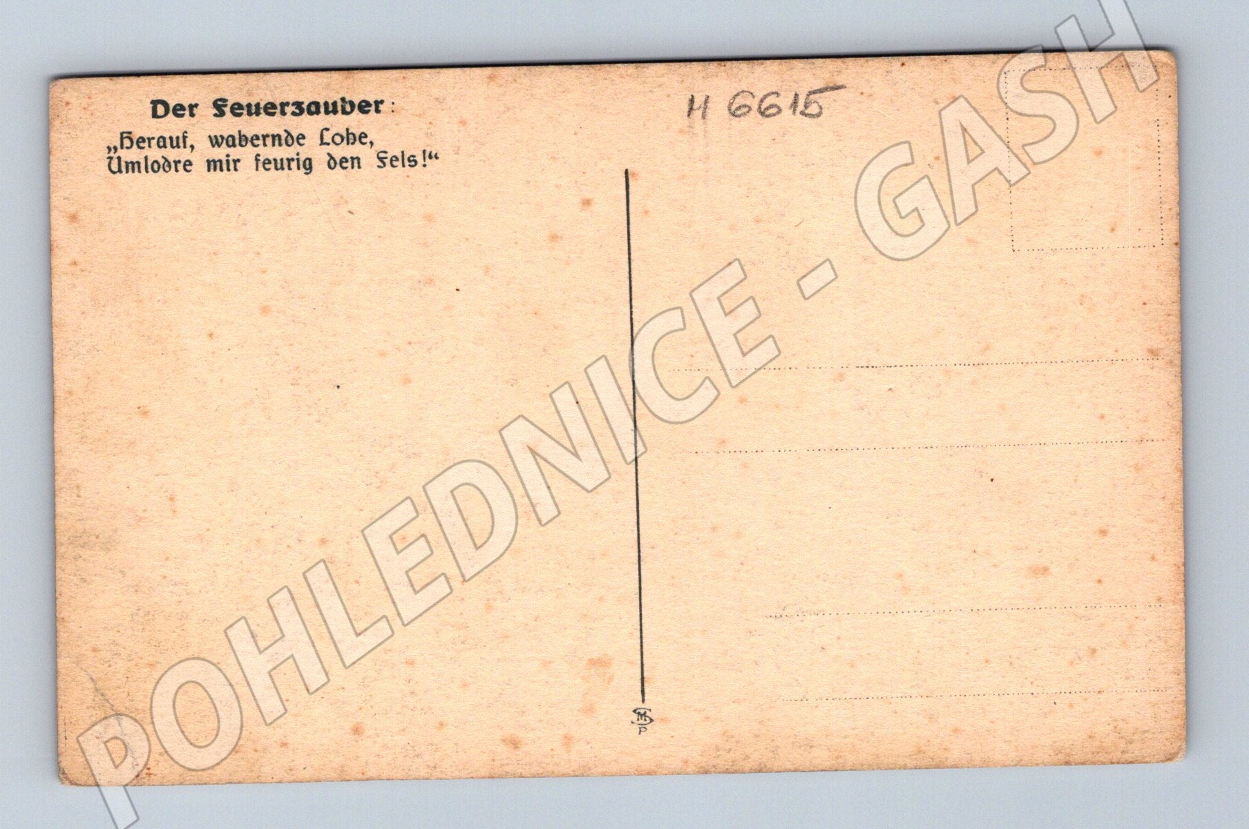 Starší pohlednice s motivem z německé mytologie nebo opery – výjev nazvaný Der Feuerzauber (Ohnivé kouzlo), což je odkaz na scénu z proslulé opery Richarda Wagnera Prsten Nibelungův. Pohlednice je bohatě barevná a vyobrazuje ženu v plamenech, pravděpodobně valkýru Brünnhildu. Na zadní straně najdete německý text: Herauf, wabernde Lohe, Umlodre mir feurig den Fels! Pohlednice byla pravděpodobně vydána kolem počátku 20. století. Stav odpovídá stáří – místy drobné skvrny, rožky mírně opotřebeny. Nevšední kus pro sběratele motivů mytologie, operní tvorby nebo německé kultury.
