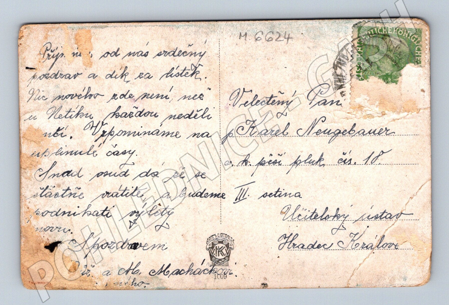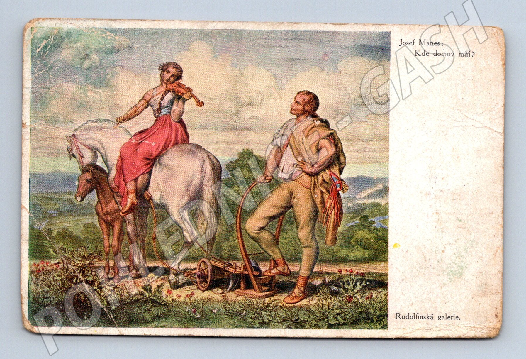Starobylá pohlednice s motivem slavného obrazu od Josefa Mánesa „Kde domov můj?“. Pohlednice zobrazuje ženu hrající na housle sedící na koni a muže v kroji v romantické krajině. U vydání je uvedena Rudolfinská galerie. Pohlednice je ručně popsána a prošla poštou, včetně dobové známky a poštovního razítka. Stav odpovídá stáří, rohy jsou mírně opotřebované, na líci jsou drobné skvrny a ohlé rohy. Cenný sběratelský kousek znázorňující českou historickou malbu a vlastenecké motivy, vhodný do sbírky starých pohlednic nebo pro milovníky českého umění.