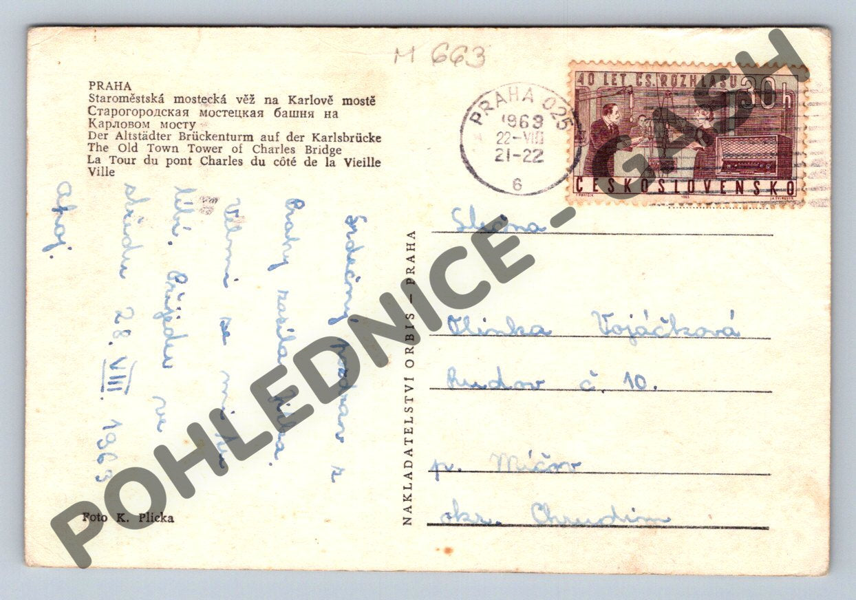Tato černobílá pohlednice zobrazuje Staroměstskou mosteckou věž na Karlově mostě v Praze, známou historickou dominantu hlavního města České republiky. Na zadní straně je pohlednice opatřena autentickou známkou a razítkem z roku 1963, spolu s ručně psaným věnováním. Fotografie je podepsána autorem K. Plickou. Pohlednice představuje vzácný sběratelský kousek s dobovým nádechem, vhodný pro milovníky historie, Prahy a filatelie. Stav pohlednice je viditelně zachovalý s drobnými známkami používání odpovídajícími stáří. Ideální položka pro sběratele pohlednic a pamětních předmětů z Československa a Prahy.