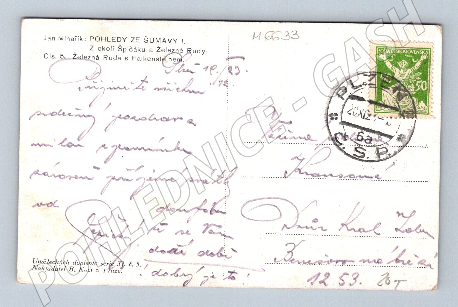 Originální malířská pohlednice Pohledy ze Šumavy I. od Jana Minaříka, zobrazující malebnou krajinu v okolí Špičáku a Železné Rudy. Jedná se o krásný sběratelský kousek z umělecké série 33, č. 5, vydaný nakladatelem B. Kočí v Praze. Pohlednice byla odeslána a je opatřena poštovním razítkem z roku 1953 a původní známkou. Na zadní straně je ručně psaný text. Ideální přírůstek do vaší sbírky historických pohlednic z období první poloviny 20. století. Stav viz foto.