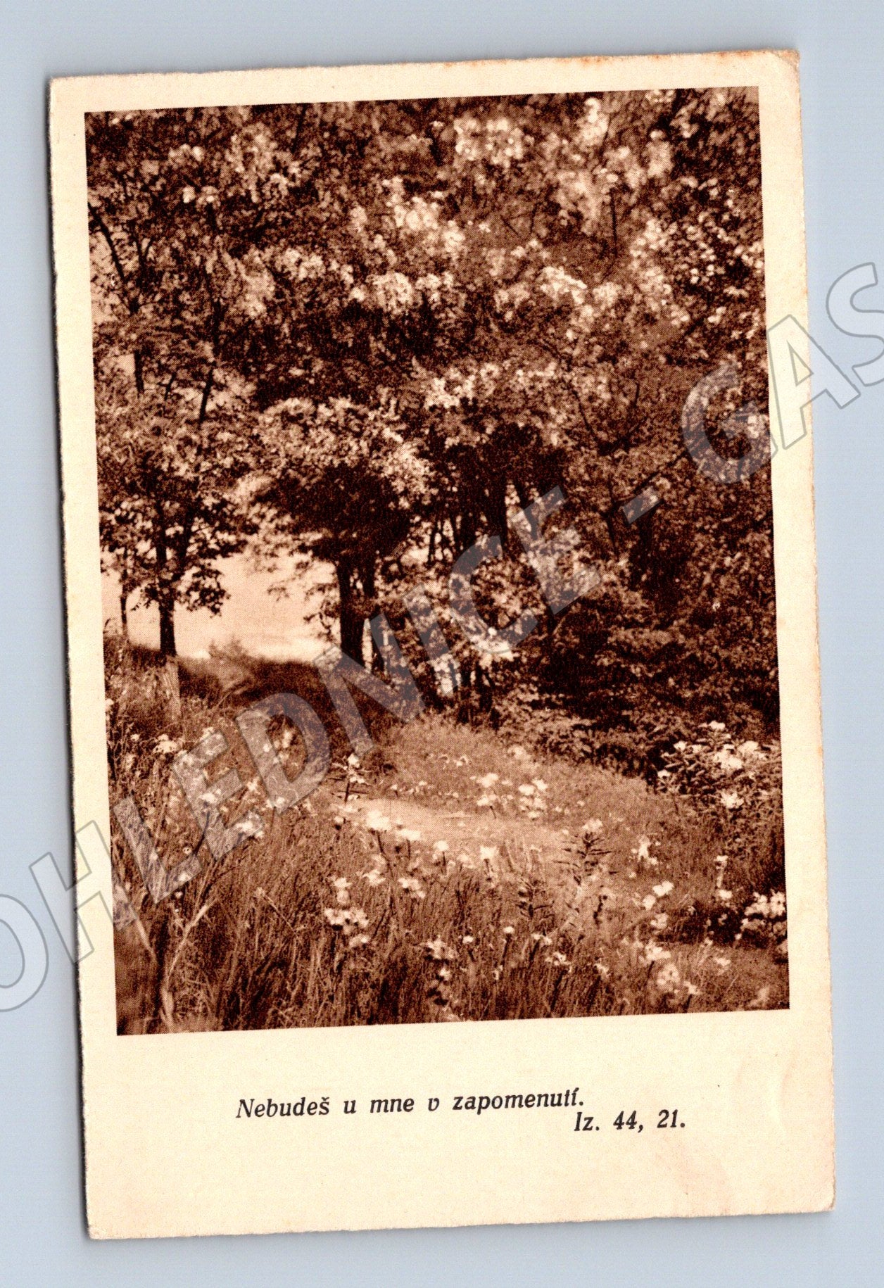 Originální stará pohlednice s námětem klidné krajiny a lesního zákoutí, doplněná citátem z Bible Nebudeš u mne v zapomenutí. Iz. 44, 21. . Na zadní straně je zachováno ručně psané osobní věnování s datací 20. 1. 1941, které dodává pohlednici autentický historický charakter. Jedná se o malý formát pohlednice, typický pro období před rokem 1950. Pohlednice je vhodná pro sběratele starých pohlednic, zájemce o českou historii a milovníky epistolární korespondence. Stav viz foto.
