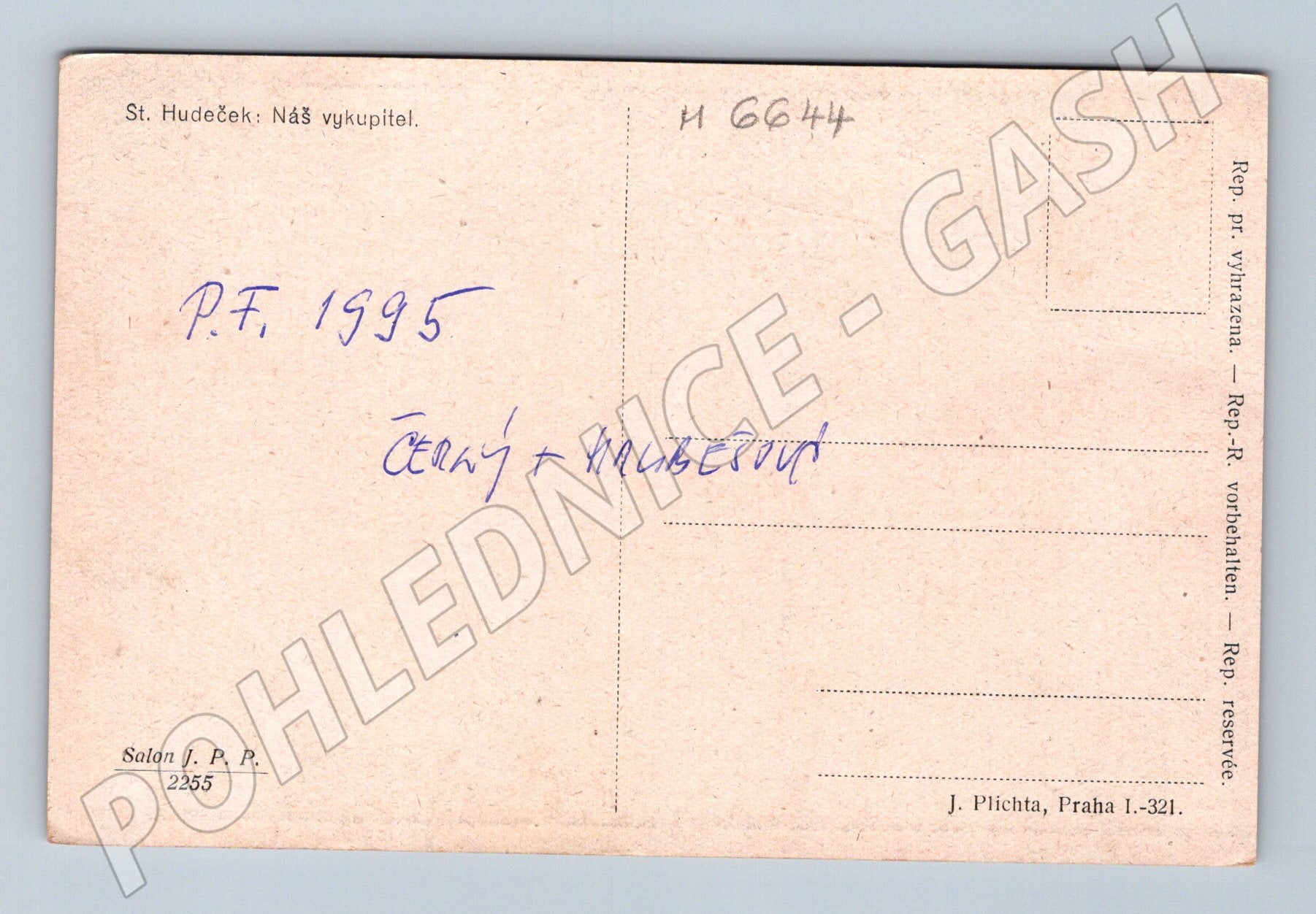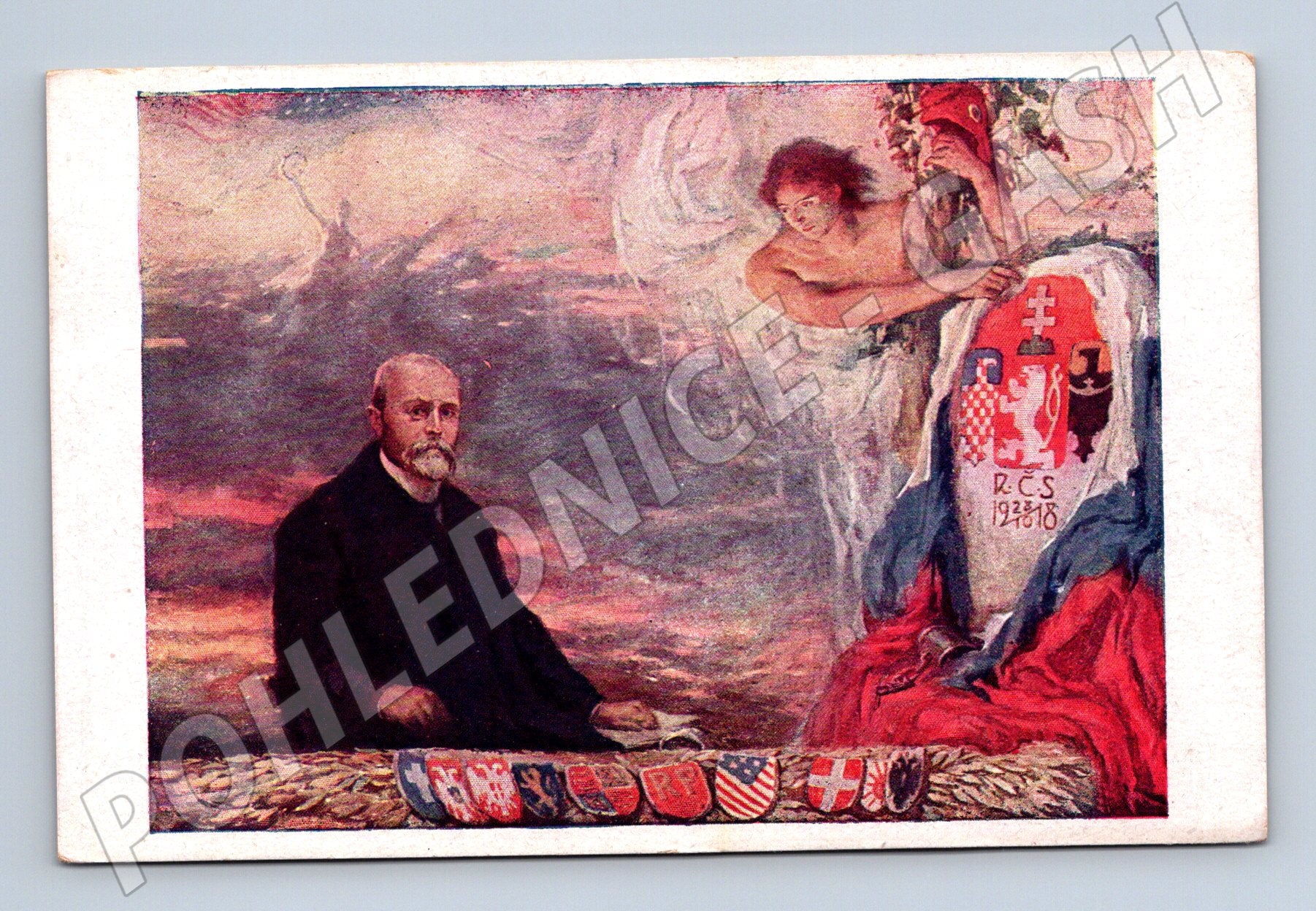 Historická pohlednice „Náš vykupitel“ od známého českého malíře Stanislava Hudečka. Na přední straně pohlednice je portrét významné osobnosti, nejspíše Tomáše Garrigua Masaryka, státní symbolika a alegorická postava. V dolní části jsou vyobrazené znaky českých a slovenských krajů, staré státní znakové motivy a letopočet 1918 (odkazující na vznik Československa). Přítisk P.F. 1935, ručně dopsané věnování. Pohlednice nese známky stáří, rohy mírně otřepené, jinak v pěkném sběratelském stavu. Vydal J. Plichta, Praha, číslo 2255. Motiv vhodný do sbírky historických pohlednic s národní tematikou či osobnostmi první republiky.