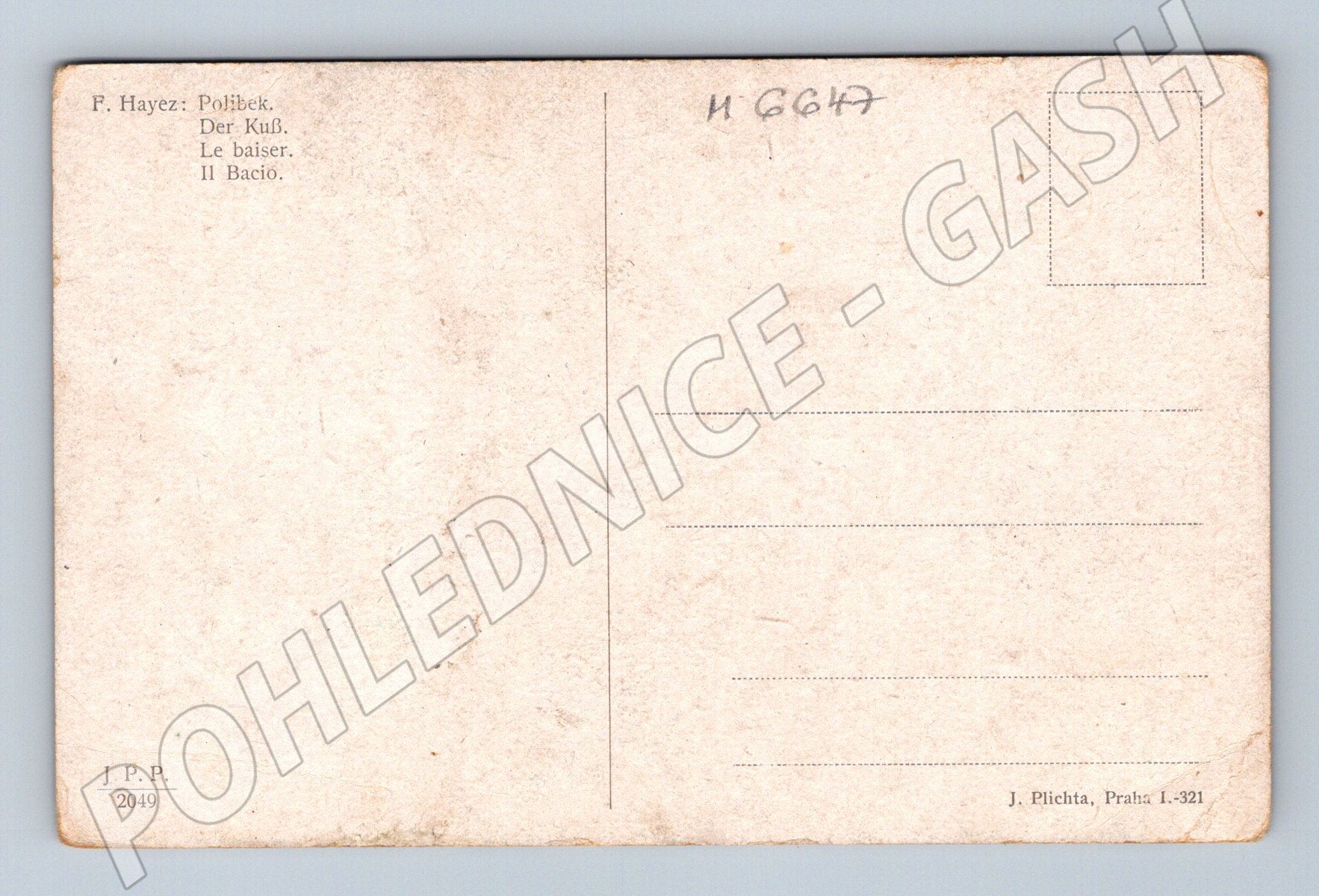 Pohlednice s reprodukcí slavného obrazu Polibek od italského malíře Francesca Hayeze. Na pohlednici je zachycena romantická scéna polibku dvou mladých lidí. Na zadní straně je uveden český, německý, francouzský a italský název díla a vydavatel J. Plichta, Praha. Přibližné stáří pohlednice, náznaky opotřebení a drobné ohyby v rozích. Krásný sběratelský kousek pro milovníky malířství nebo romantických motivů.