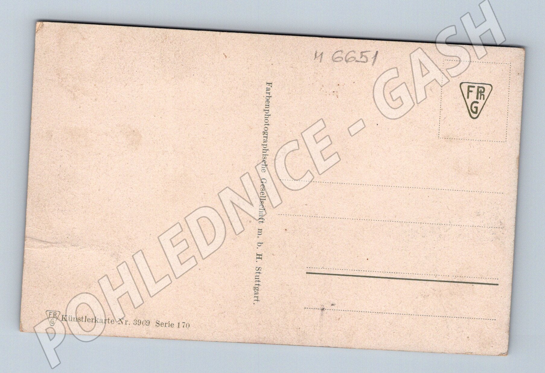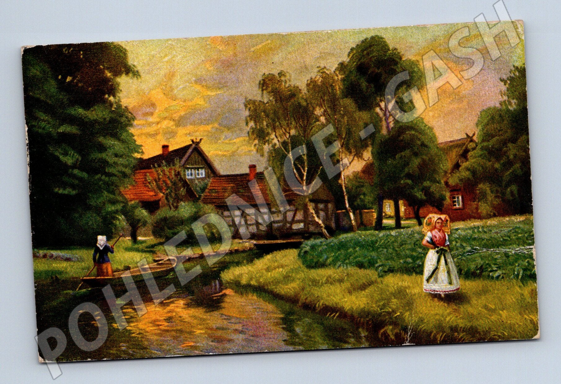 Originální stará pohlednice s malovaným motivem tradiční německé vesnice s hrázděnými domy, řekou a postavami v krojích. Na přední straně vidíme idylickou venkovskou scenérii při západu slunce – ženu v loďce na řece a mladou dívku v tradičním oděvu na břehu. Jedná se o uměleckou pohlednici (Künstlerkarte Nr. 3969 Serie 170) vydanou společností Farbenphotographische Gesellschaft m.b.H. Stuttgart. Pohlednice je nepopsaná a neprošlá poštou, uchovaná ve velmi dobrém stavu s drobnými známkami stáří (jemné ohyby, viz foto). Skvělý přírůstek do sbírky historických německých pohlednic nebo milovníka etnografie.