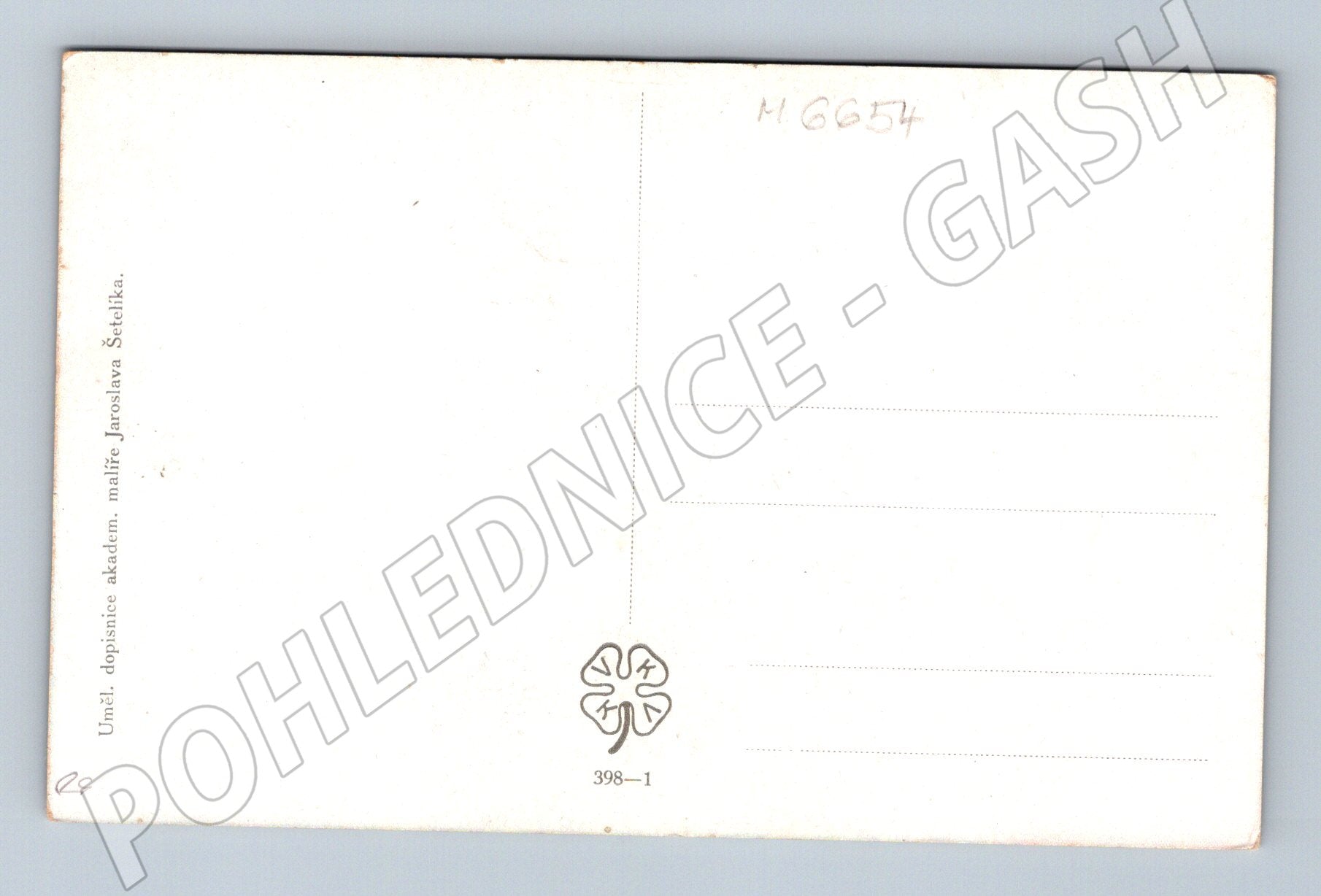 Tato malebná pohlednice zobrazuje venkovskou krajinu s dominantním křížem nebo sochou u cesty, okolními stromy a chalupami ve stylizovaném podání. Jedná se o menší formát pohlednice z období do roku 1950. Na okraji adresní strany je uvedena poznámka: Úmel. dopisnice akadem. malíře Jaroslava Šetelíka. Originál české pohlednice, která zachycuje atmosféru venkovského života a krajiny na našem území. Zadní strana je čistá, vhodná ke sběratelským účelům i k zaslání. Pohlednice je ve velmi pěkném stavu bez výraznějších stop opotřebení.