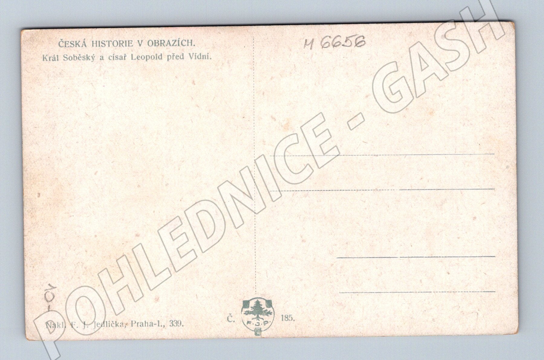 Historická pohlednice z edice Česká historie v obrazech s názvem Král Soběský a císař Leopold před Vídní . Na přední straně je umělecká malba zachycující setkání dvou významných historických postav – polského krále Jana III. Sobieského a císaře Leopolda I. před bitvou o Vídeň v roce 1683. Barevná malba obsahuje spoustu detailů, jako jsou prapory, koně a výpravné kostýmy. Pohlednice je nevypsaná, v dolní části je označení vydavatele F. J. Jedlička, Praha. Velmi pěkný stav, vhodné do sbírky historických pohlednic s tématikou malířství či české historie.