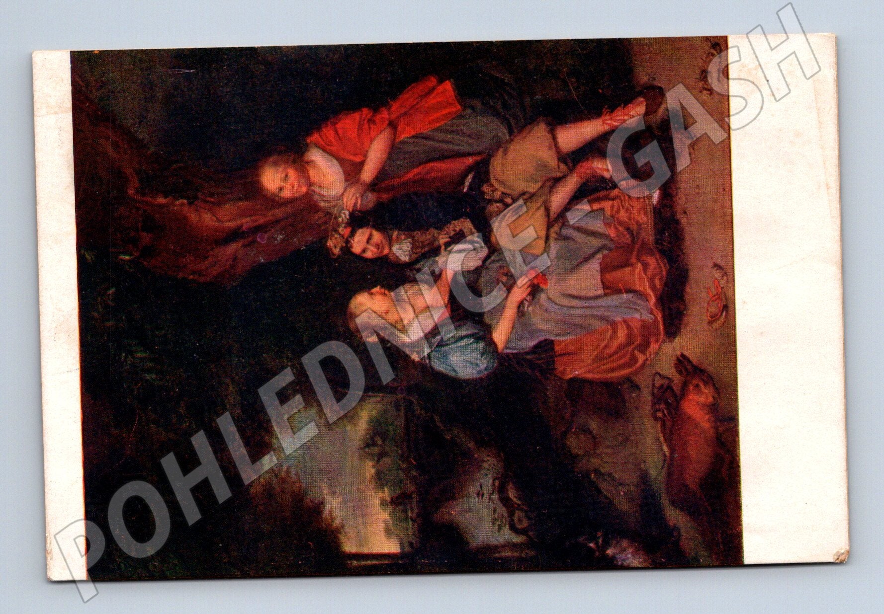 Nabízím starou pohlednici s reprodukcí malířského díla zobrazujícího několik postav v dramatické scéně v přírodě. Pohlednice je nepopsaná, zadní strana neprošlá poštou a v dobrém stavu s mírným opotřebením hran odpovídajícím stáří. Vhodné pro sběratele pohlednic nebo zájemce o umělecké reprodukce klasiků. Ideální do sbírky či jako dekorace v interiéru.