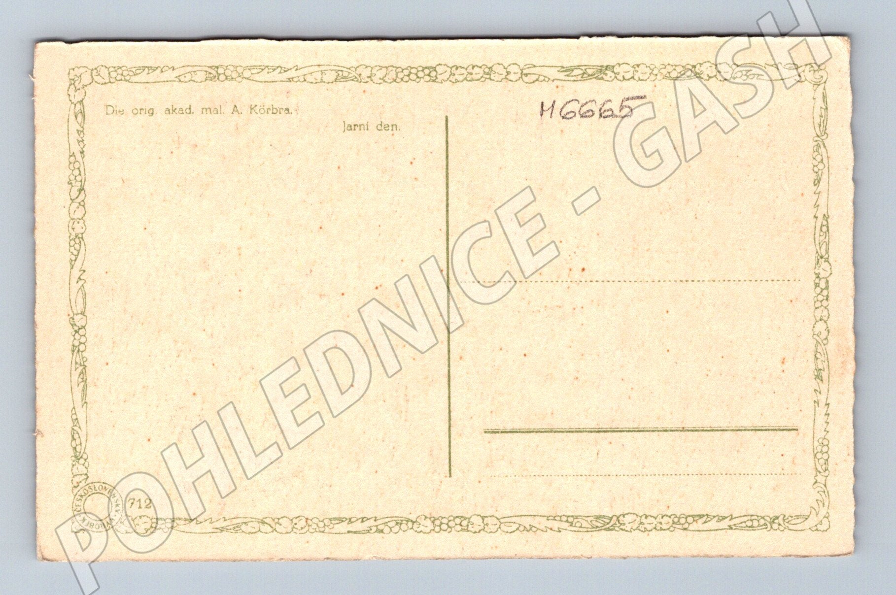 Krásná stará pohlednice s motivem malebného venkovského stavení na okraji lesa, malovaná akademickým malířem A. Köbrnem. Název obrazu je Jarní den . Ručně kolorovaná pohlednice je vytištěna v Československu, vyznačuje se detailním a jemným zpracováním krajiny i domku. Na zadní straně je originální značení a jemný okrasný rám kolem prostoru pro text a adresu. Pohlednice je ve velmi dobrém stavu, bez nápisu nebo poštovního razítka. Skvělý sběratelský kus pro milovníky českých pohlednic a venkovské tematiky.
