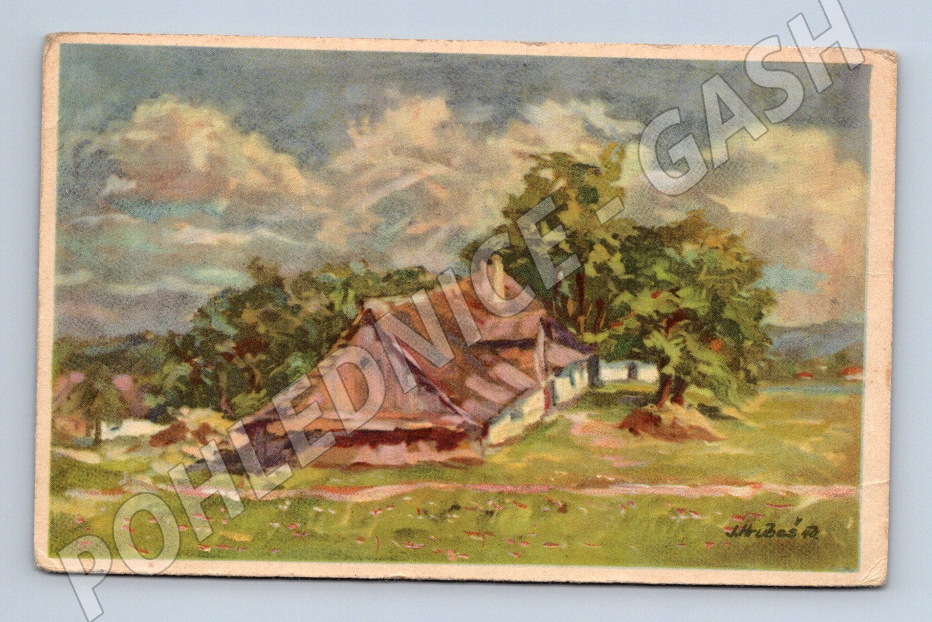 Originální stará pohlednice s malovaným motivem české chalupy na venkově, podepsána malířem (signatura na přední straně). Pohlednice byla odeslána, na zadní straně je původní rukopisný text, adresa a známka Československo (hodnota 30h) s poštovním razítkem. Pohlednice pochází z první poloviny 20. století, jedná se o sběratelský kousek vhodný do tematických sbírek či jako dekorace. Stav podle skenu – mírné opotřebení, zaoblené rohy, patina odpovídající stáří. Formát menší než dnešní standard. Ideální pro milovníky starých pohlednic a české venkovské krajiny.