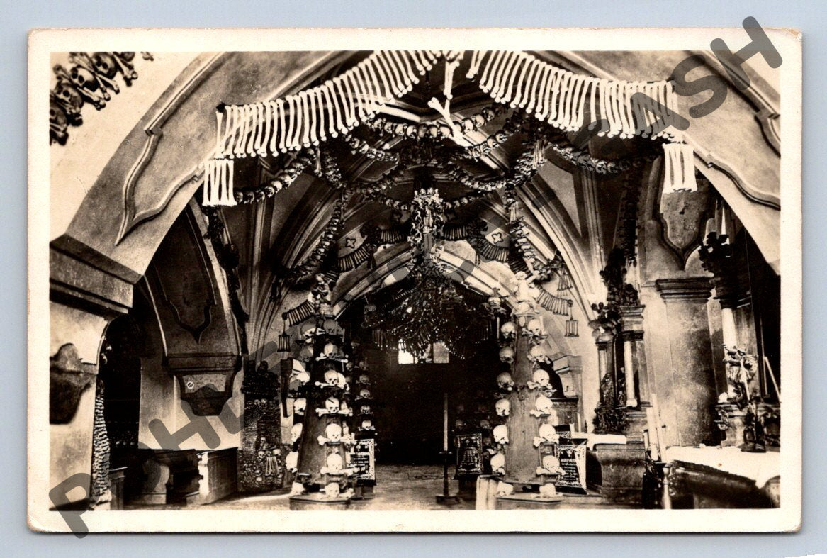Tato vintage pohlednice zachycuje interiér známé Sedlecké kostnice, unikátní historické památky nacházející se v Sedlci u Kutné Hory. Fotografie v černobílém provedení ukazuje gotickou kapli zdobenou fascinujícími dekoracemi z kostí, které tvoří dekorativní oblouky a lustry. Pohlednice na zadní straně nese popisek Sedlec pod Kaňkem a je tištěna vydavatelstvím Orbis. Je ve velmi dobrém zachovalém stavu, vhodná pro sběratele historických pohlednic a milovníky architektury či netradičních památek. Skvělý doplněk do každé sbírky či k zajímavému vystavení.