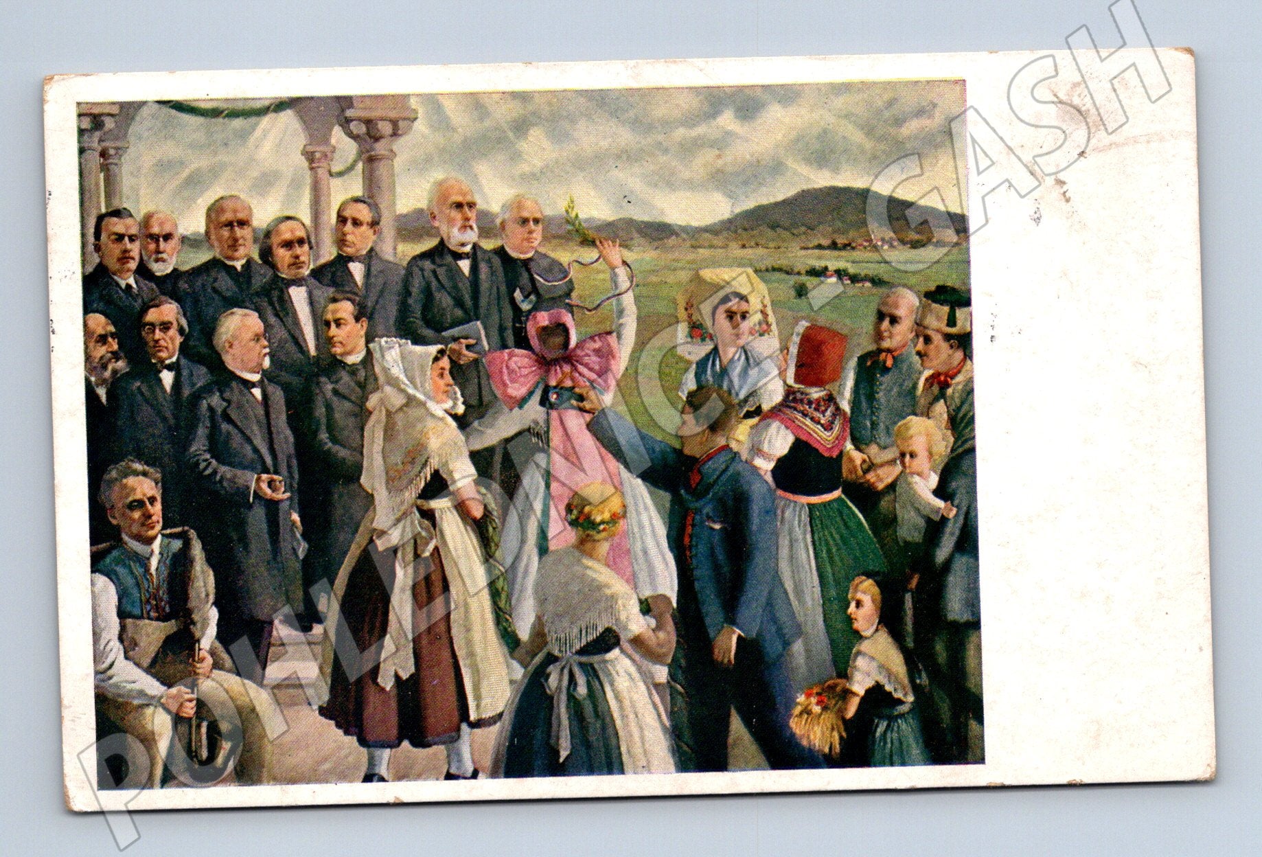 Starší pohlednice s etnografickým motivem, zobrazující slavnostní setkání Lužických Srbů. Na přední straně barevná kresba – skupina osob v krojích a dobovém oblečení na pozadí krajiny a vesnice. Pozornost upoutají detaily tradičních krojů, hudebník s dudami i slavnostní atmosféra, která je vyjádřena i nápisem na zadní straně (Hold lužickým vlastencům). Pohlednice je prošlá poštou, opatřena známkou ČSR (50 haléřů), na zadní straně ručně psané věnování a adresa. Vhodné pro sběratele národopisných pohlednic, doklad historie a kultury Slovanů – Lužických Srbů. Rozměr klasický, stav odpovídá stáří (stopy opotřebení, viz foto).